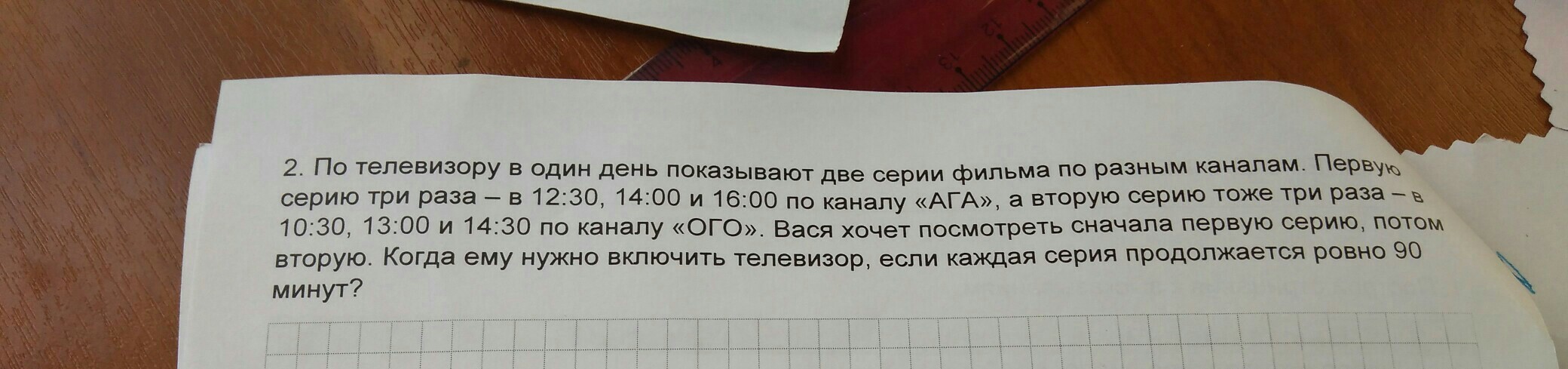 Вася включает телевизор в 12.30 канал АГА смотрит первую серию. затем переключается канал ОГО и 14.00 смотрит вторую серию :))