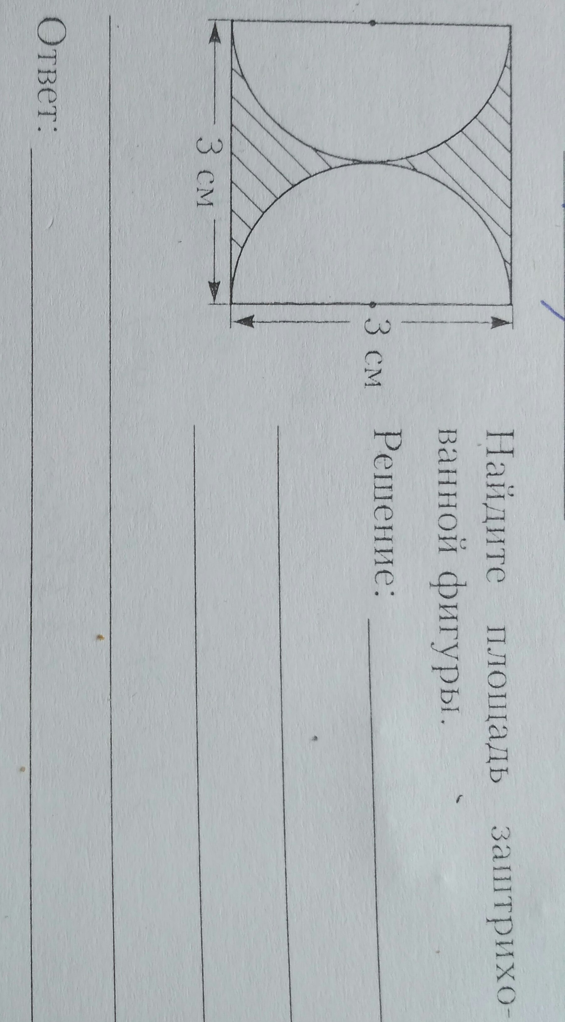 Чтобы найти площадь заштрихованной фигуры надо от площади квадрата отнять площадь 2 частей полукруга 9-7,065==1,935 см²