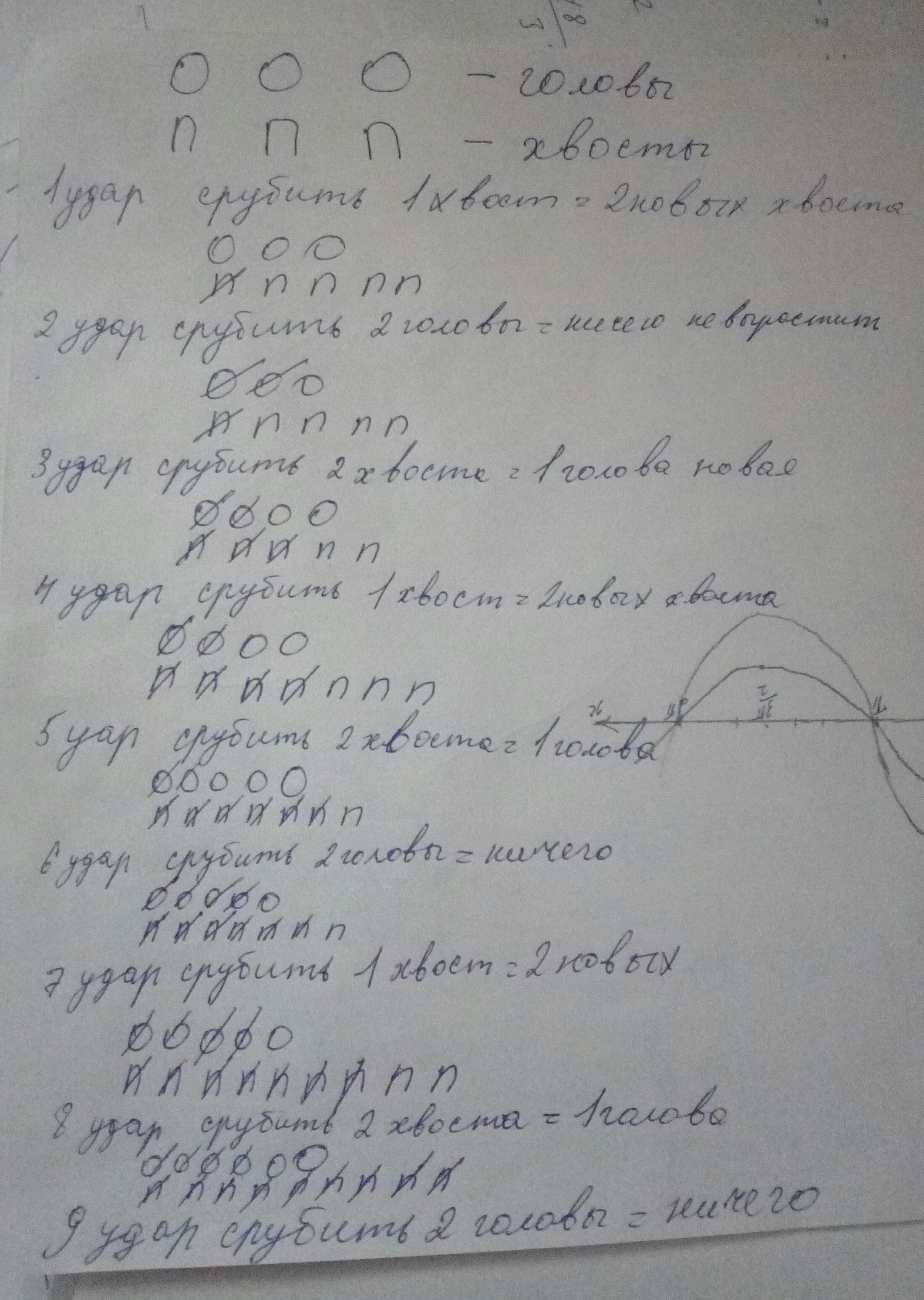 — Вот тебе меч-кладенец, — сказала царевичу Баба Яга. Одним ударом ты можешь срубить Змею либо одну голову, либо две головы, либо один хвост, либо два хвоста. Запомни: срубишь голову — новая вырастет; срубишь хвост . два новых вырастут; срубишь два хвоста — голова вырастет; срубишь две головы — ничего не вырастет.