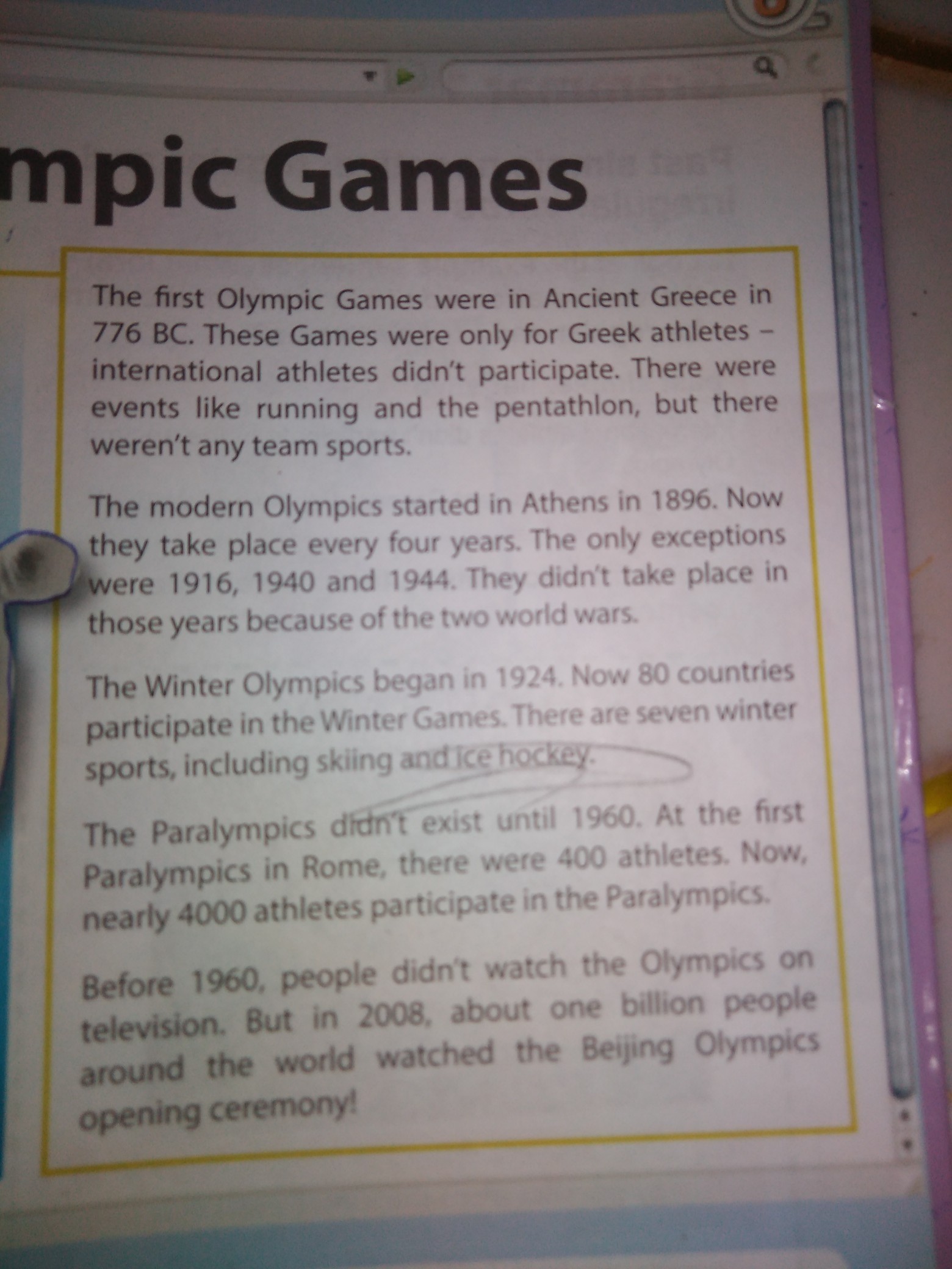 Зимние олимпийские игры начались в Афинах в 1924 году. Сейчас 80 стран принимает участие в Зимних играх. Существует 7 зимних видов спорта, включая фигурное катание и хоккей.