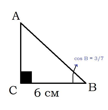 Дано: ΔABC; ∠С=90°; BC = 6 см; cos B = 3/7