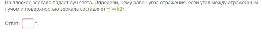 На плоское зеркало падает луч света. Определи, чему равен угол отражения, если угол между отражённым лучом и поверхностью зеркала составляет γ=52°.