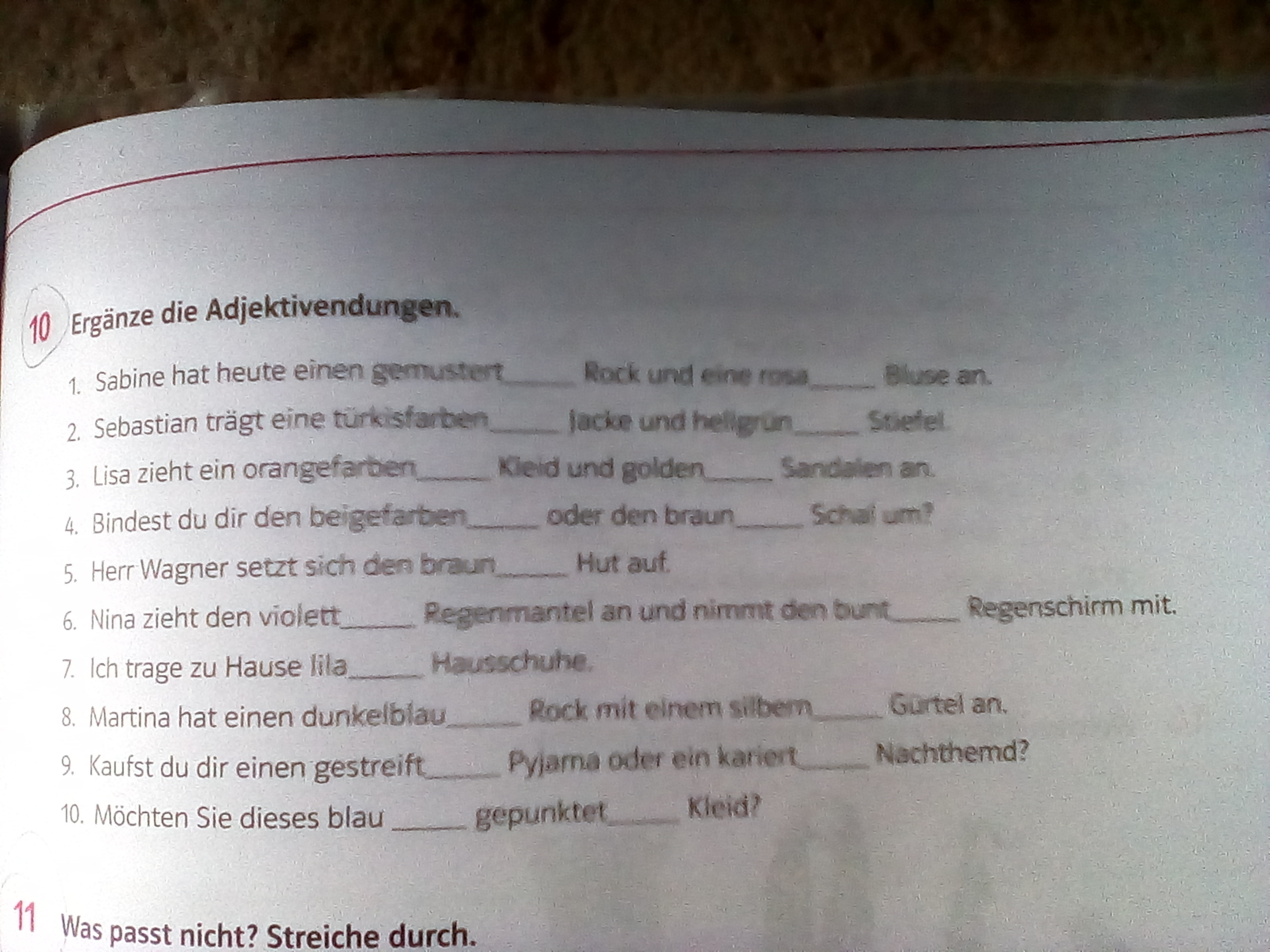10. 1. gemusterten, rosa2. türkisfarbene, hellgrüne3. orangefarbenes, goldene4. beigefarbenen, braunen5. braunen6. violetten, bunten7. lila8. dunkelblauen, silbernen9. gestreiften, kariertes10. blaue, gepunktete