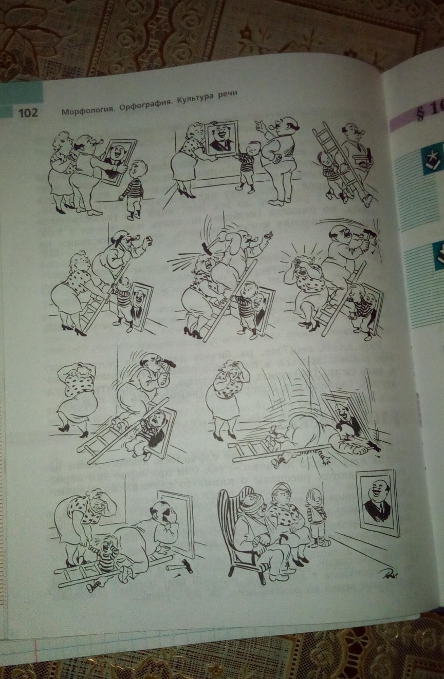 он взял свой портрет и на чел хвастоца и захоте перевесить,они с сыном сходили за лесницай. все держат лестницу чтобы не упала, мужчина замахнулся и попал по жене попал в лоб, жена отошла от боли и сын отпустил хотел помочь жене, лесниуа упала и мужчина упал на мальчика, женщина достает с завала ребёнка, и они все месте смотрят на картину и они в бинте