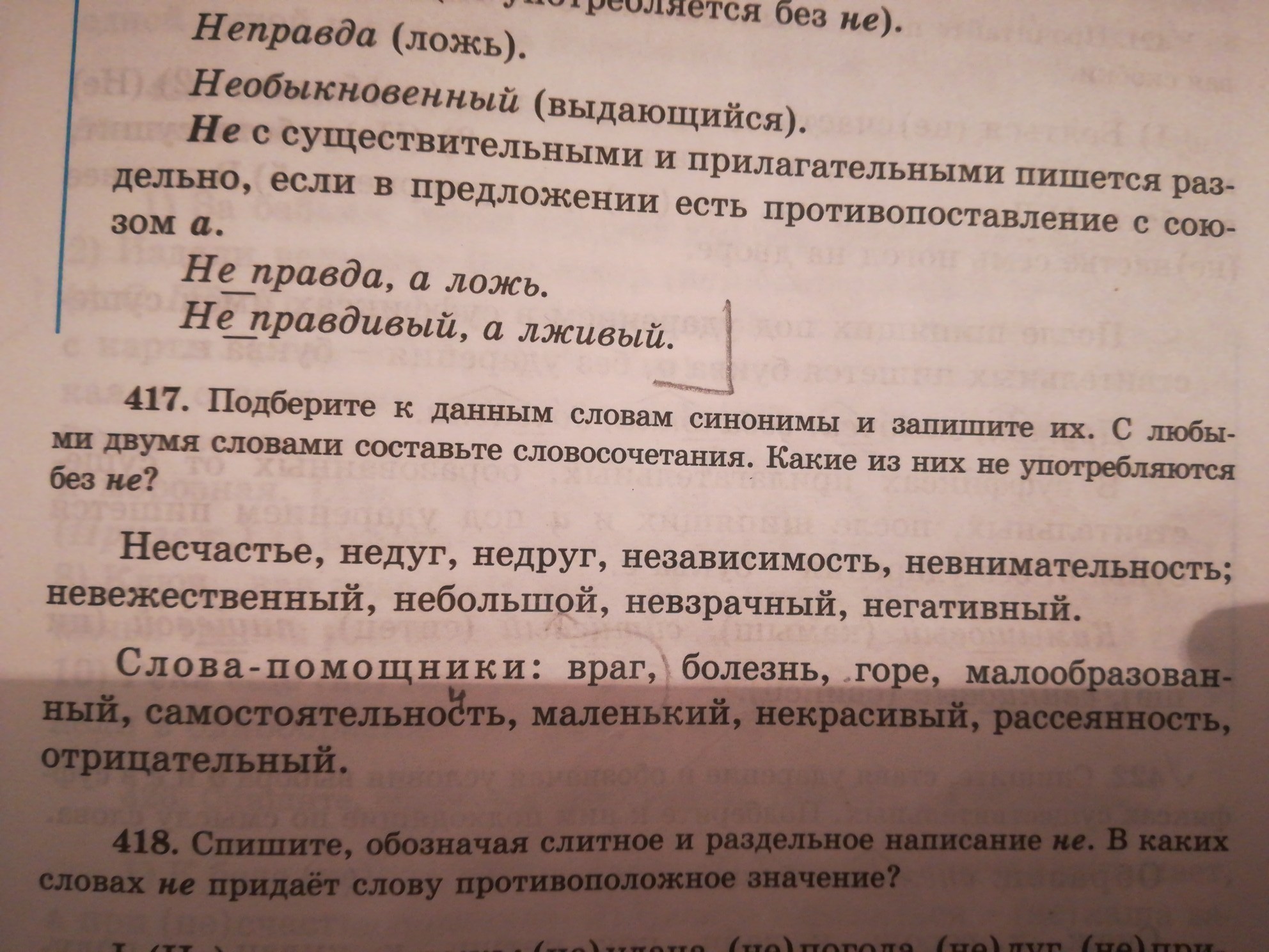 Несчастье-горе, недуг-болезнь, недруг-враг,независимость-самостоятельность, невнимательность-рассеянность,невежественный-малообразованный,небольшой-маленький,невзрачный-некрасивый,негативный-отрицательный