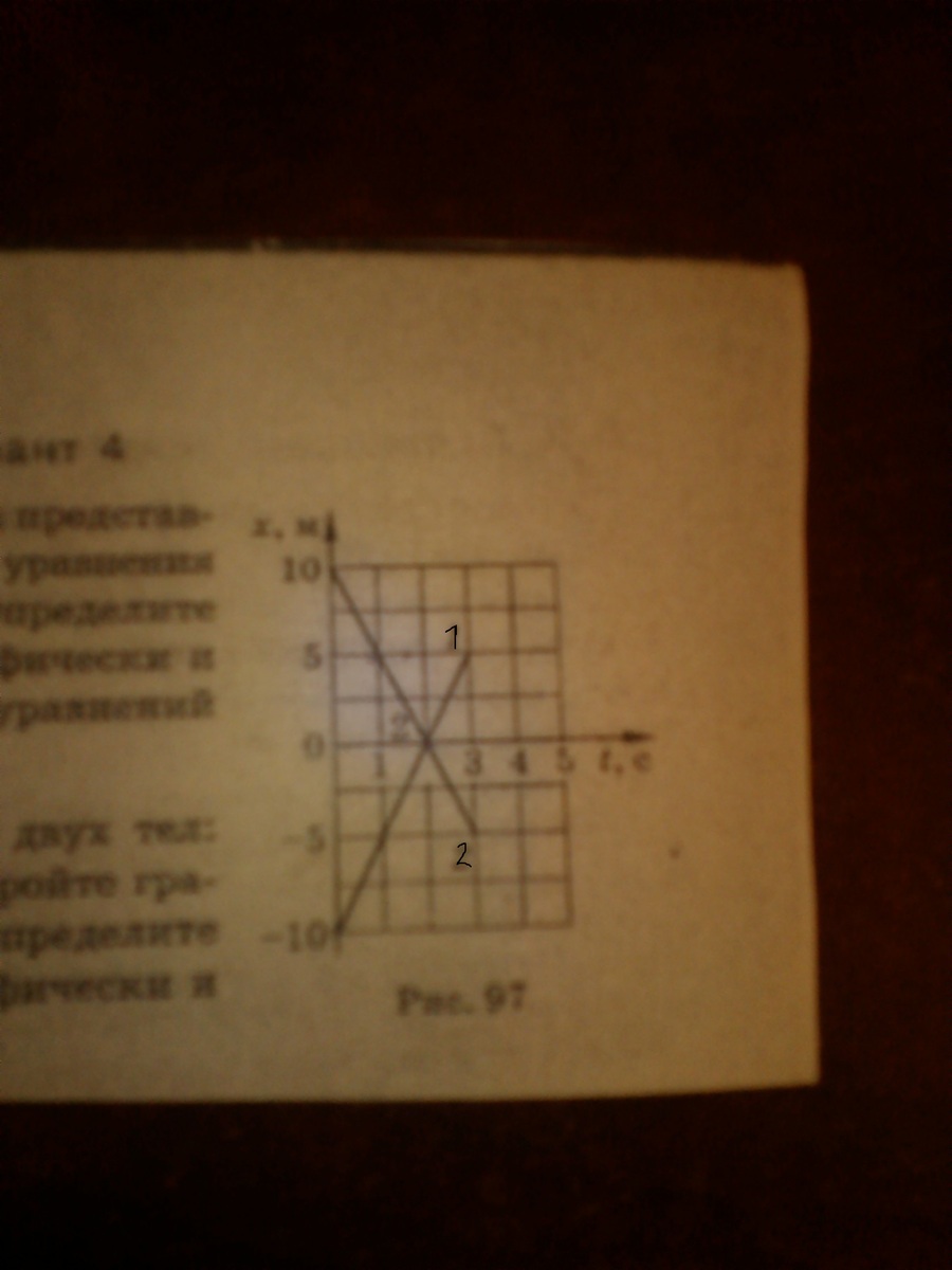 Графики движения двух тел представлены на рисунке. напишите уравнения движения x=x ( t ) этих тел.Определите место и время их встречи графически и аналитически.(с помощью уравнений движения)