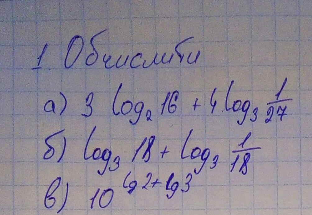 3log_216+4log_3 frac{1}{27}=3*log_22^4+4*log_23^{-3}=\=3*4+4*(-3)=12-12=0\\log_318+log_3 frac{1}{18}=log_3(18* frac{1}{18})=log_31=0\\10^{lg2+lg3}=10^{lg(2*3)}=10^{lg6}=6