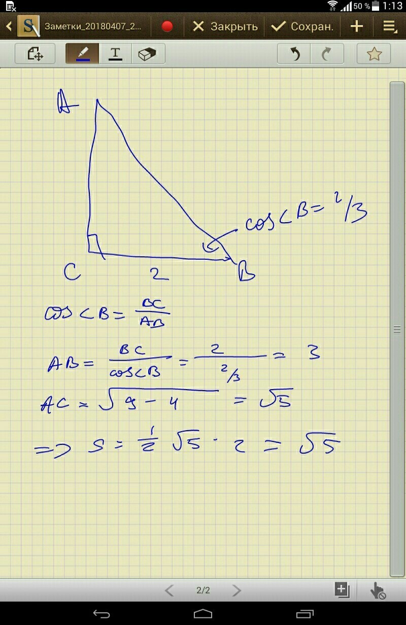 В треугольнике АВС угол С прямой, cosB=2/3, ВС=2. Найдите АВ, АС и площадь треугольника