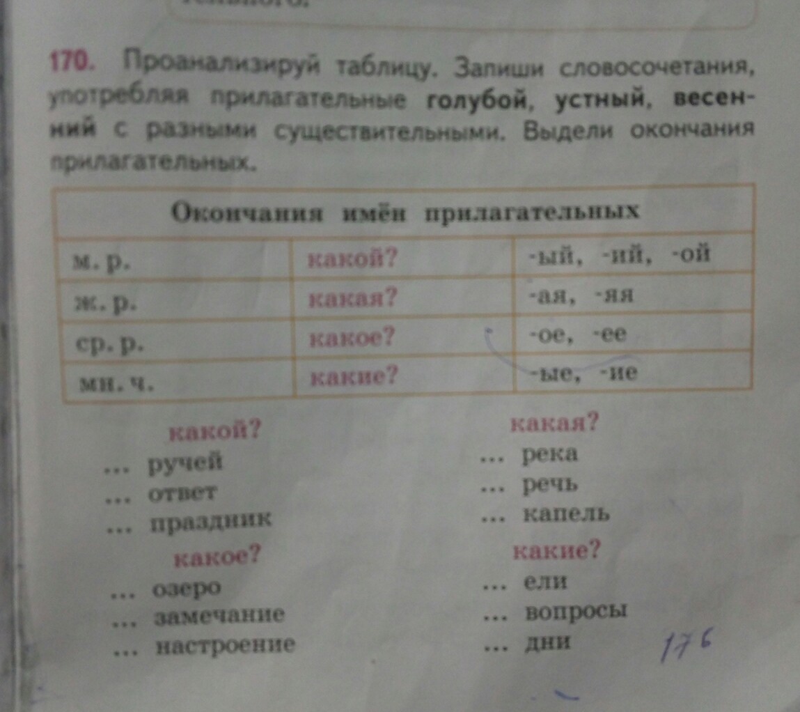 проанализируйте таблицу Запиши словосочетания употребляя прилагательные голубой устные Весенний с разными существительными Выдели окончания прилагательных