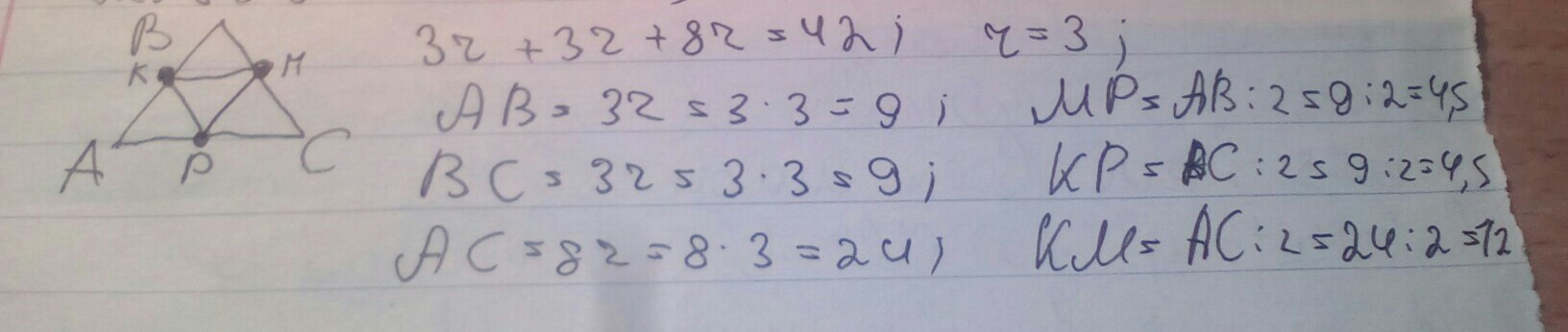 Стороны треугольника относятся как 3 : 3 : 8, а периметр треугольника, образованного его средними линиями, равен 42 см. Найдите средние линии треугольника.