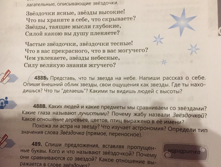 Привет, я маленькая звёздочка по имени "Сияние". Я живу в космосе, среди многочисленных планет, звёзд, комет. Я очень яркая и занимаюсь тем, что помогаю тёте Солнцу освещать свою планету-подругу, Землю. Мама звёздочка и папа звезда говорят мне, что мой возраст уже более, чем 200 тысяч лет! Как я уже говорила, я знакома с планетой Земля. Мы с ней дружим 142 года, и я могу её совершенно спокойно назвать своей лучшей подругой. Она рассказывает, что на ней живут маленькие "человечки", которые доставляют ей очень много проблем и боли тем, что они строят свои заводы, которые загрязняют воздух, и Земле тяжело из-за них дышать. Так же они вырубают деревья, которые корнями связаны с Землёй, и при каждом вырубленном дереве Земле становится очень больно. Сейчас я расскажу поподробнее о своей тёте Солнце. Она занимается тем, что освещает Землю. Именно благодаря ей маленькие человечки встают по утрам, гуляют, наслаждаются жарким летом, плавают на речках и делает много всего остального. Раз в год моя тётя перестаёт греть одну сторону Земли и начинает греть другую. Когда она греет одну сторону, на ней начинается лето, а на второй - зима.