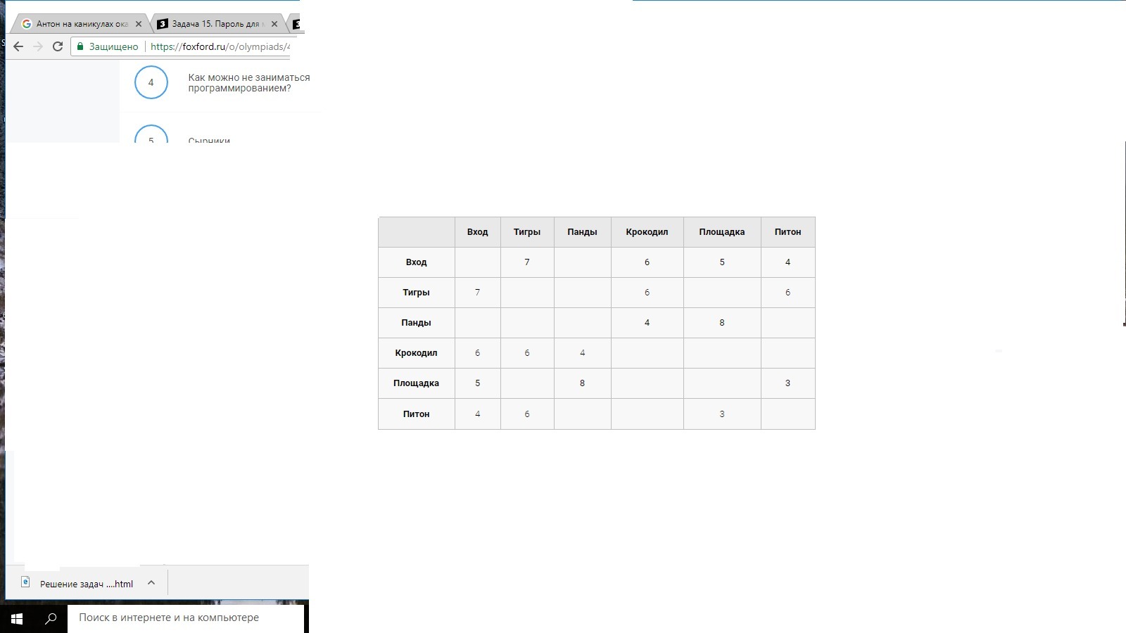 Антон на каникулах оказался в одном интересном городе, где есть зоопарк. У Антона есть совсем немного времени на его осмотр, поэтому он решил посетить только пять самых интересных мест: посмотреть тигров, панд, крокодила, питона и зайти на детскую площадку. Некоторые из этих мест соединяют дорожки. В таблице приведено время перемещения по дорожкам (на пересечении строки с надписью Панды и столбца с надписью Крокодил записано время перемещения Антона по прямой дорожке между вольером с пандами и вольером с крокодилом. Если же ячейка пуста, то прямой дорожки между объектами нет). На осмотр одного объекта Антон тратит ровно 5 минут. Определите, за какое наименьшее время Антон сможет посмотреть все пять объектов и вернуться к входу? Сейчас Антон только вошел в зоопарк и стоит у таблички Вход.