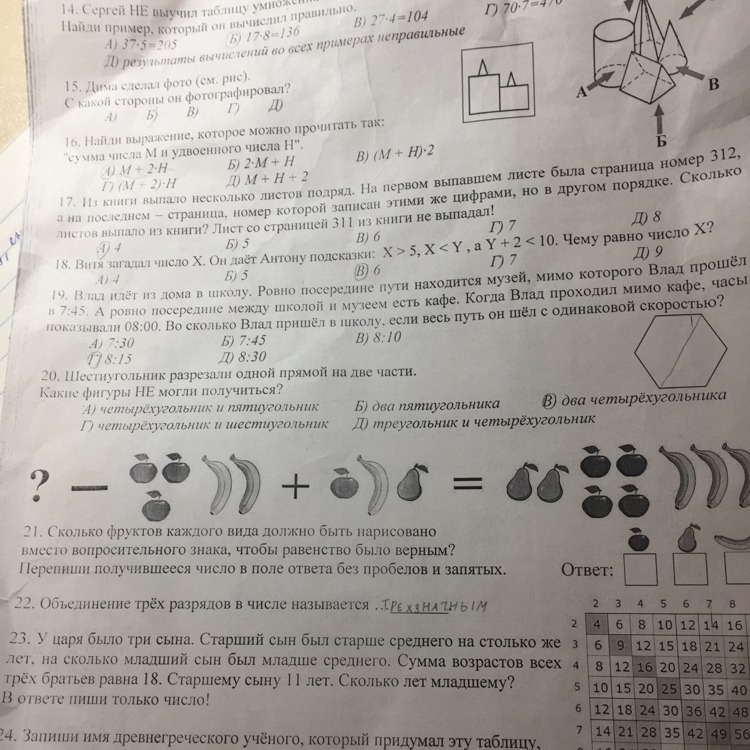 Сколько фруктов каждого вида должно быть нарисовано вместо вопросительного знака , чтобы равенство было верным?