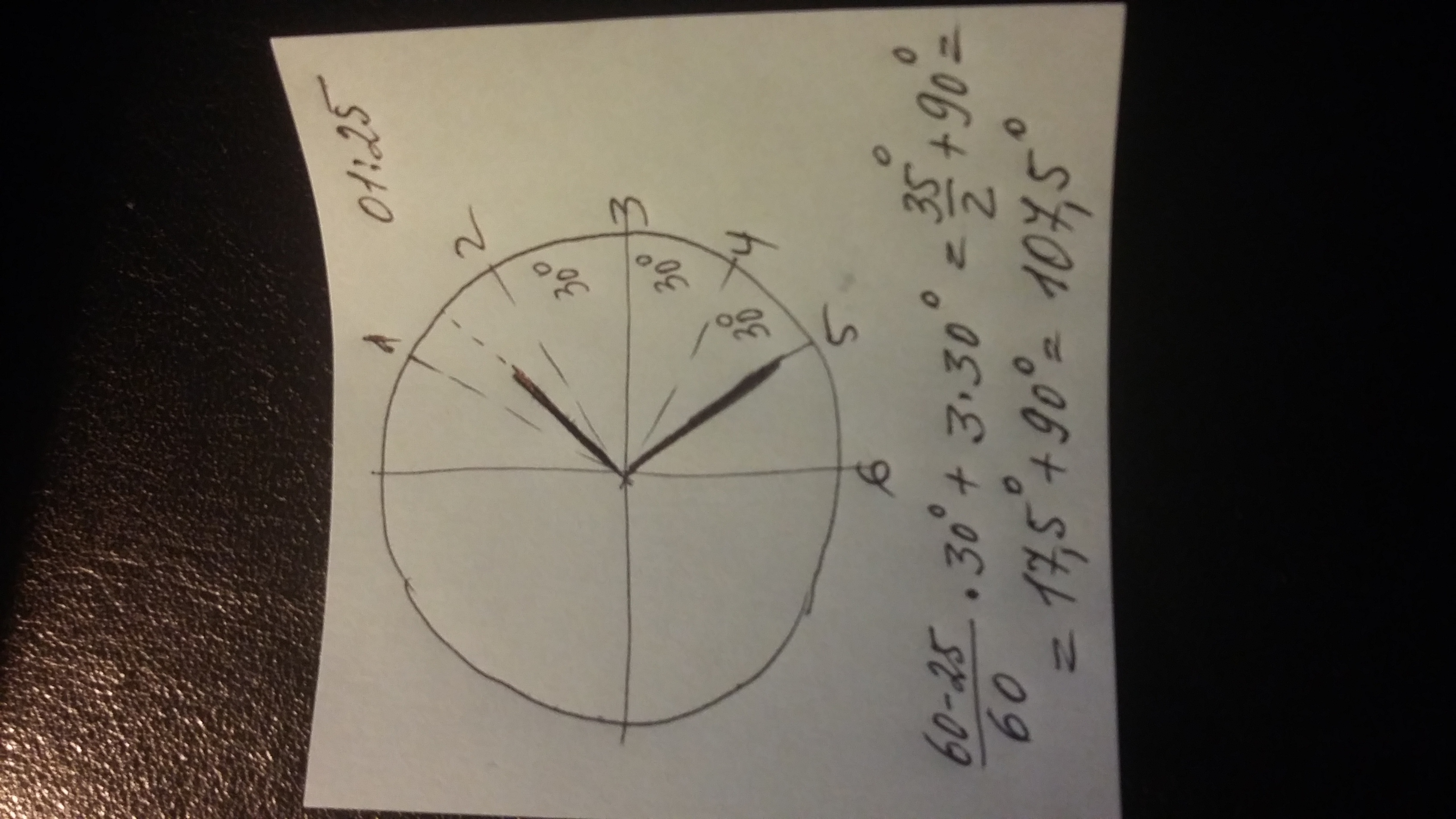 30°* (60-25)/60 + 30°*3= 35/2+90°= 17,5°+90=107,5°