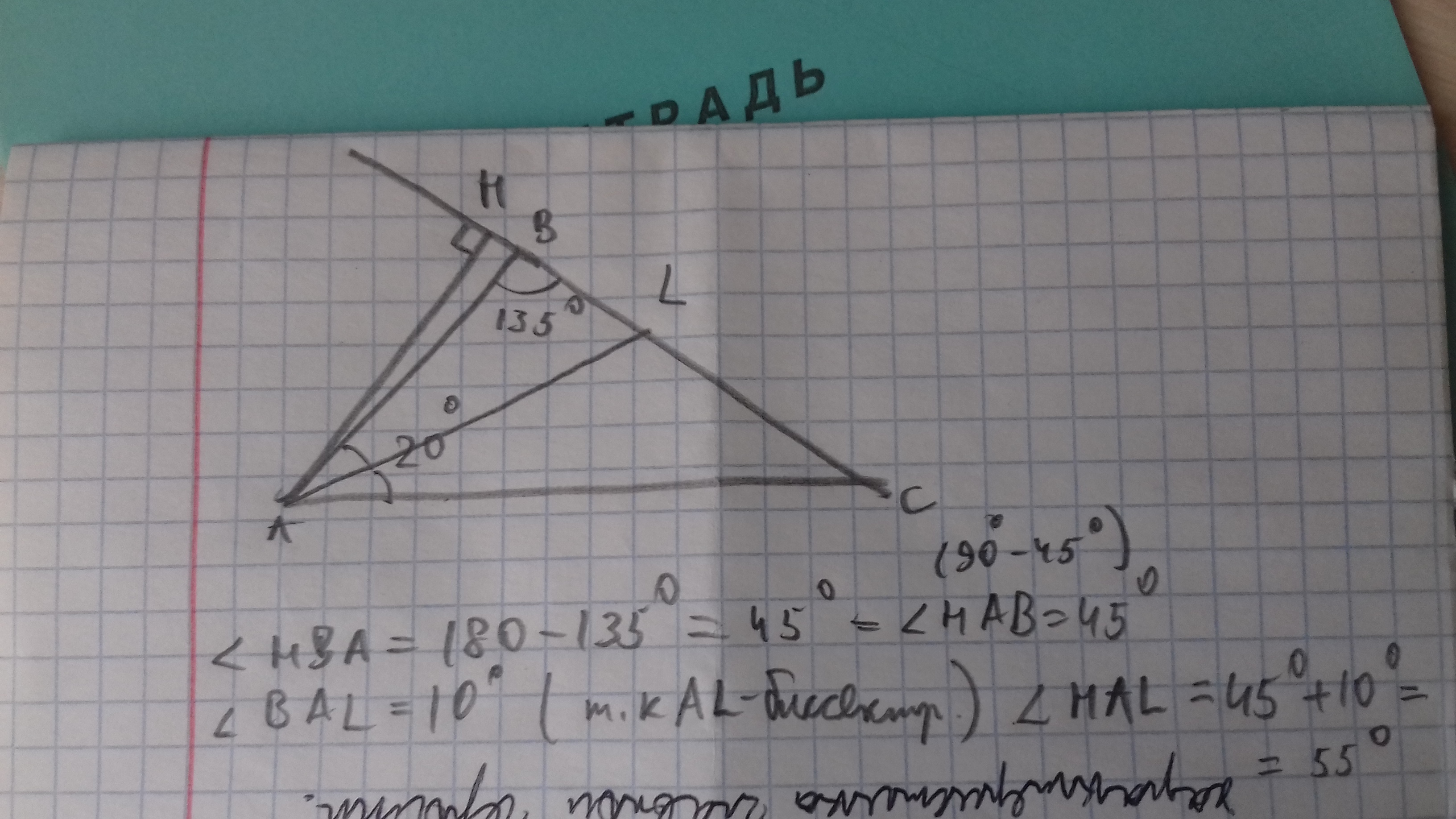 ah и al-высота биссектриса треугольника abc соответственно,угол A =20°,угол B = 135°. Найти угол HAL.