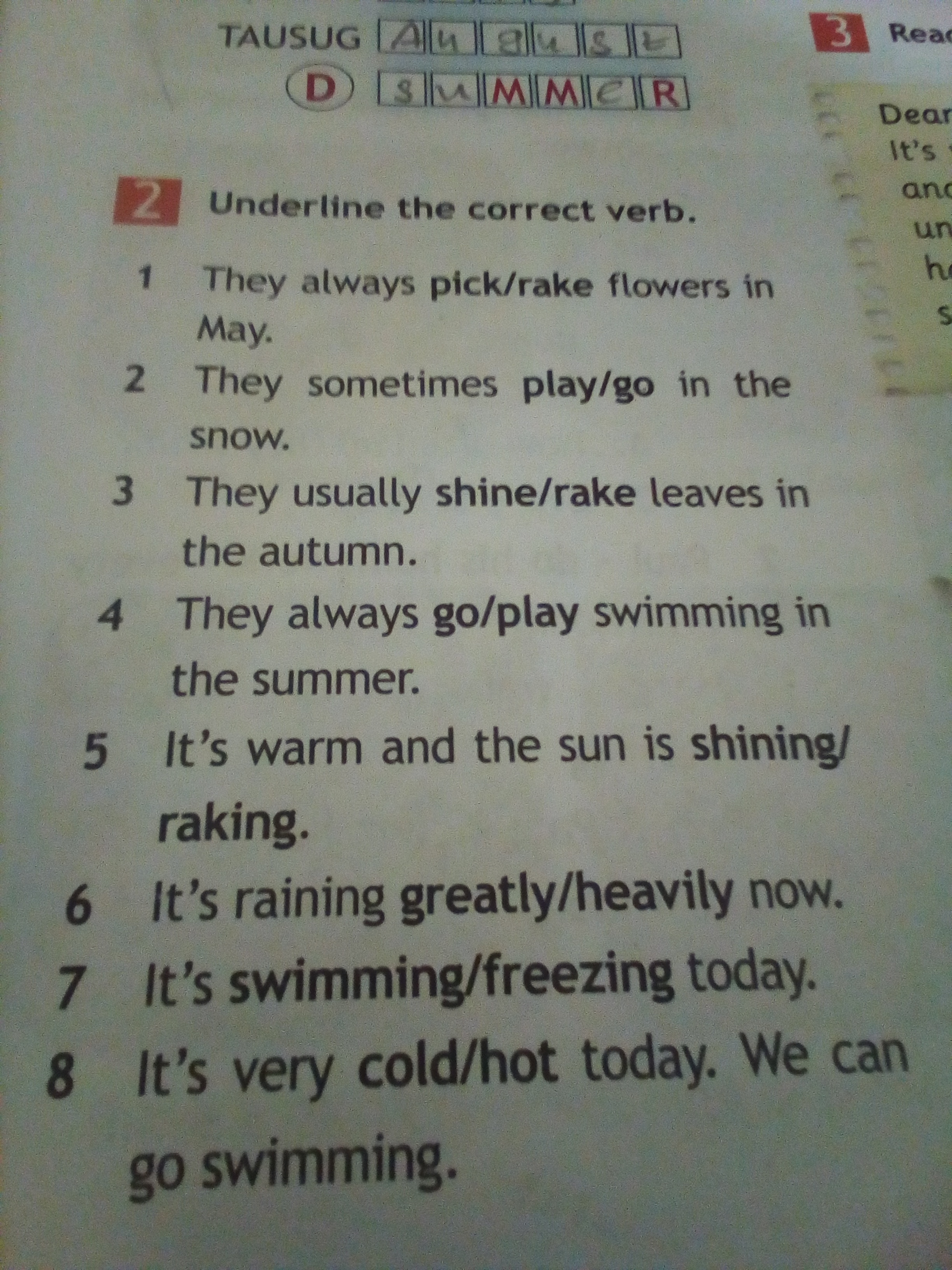 1) pick; 2) play; 3) rake; 4) go; 5) shining; 6) heavily; 7) freezing; 8) hot.