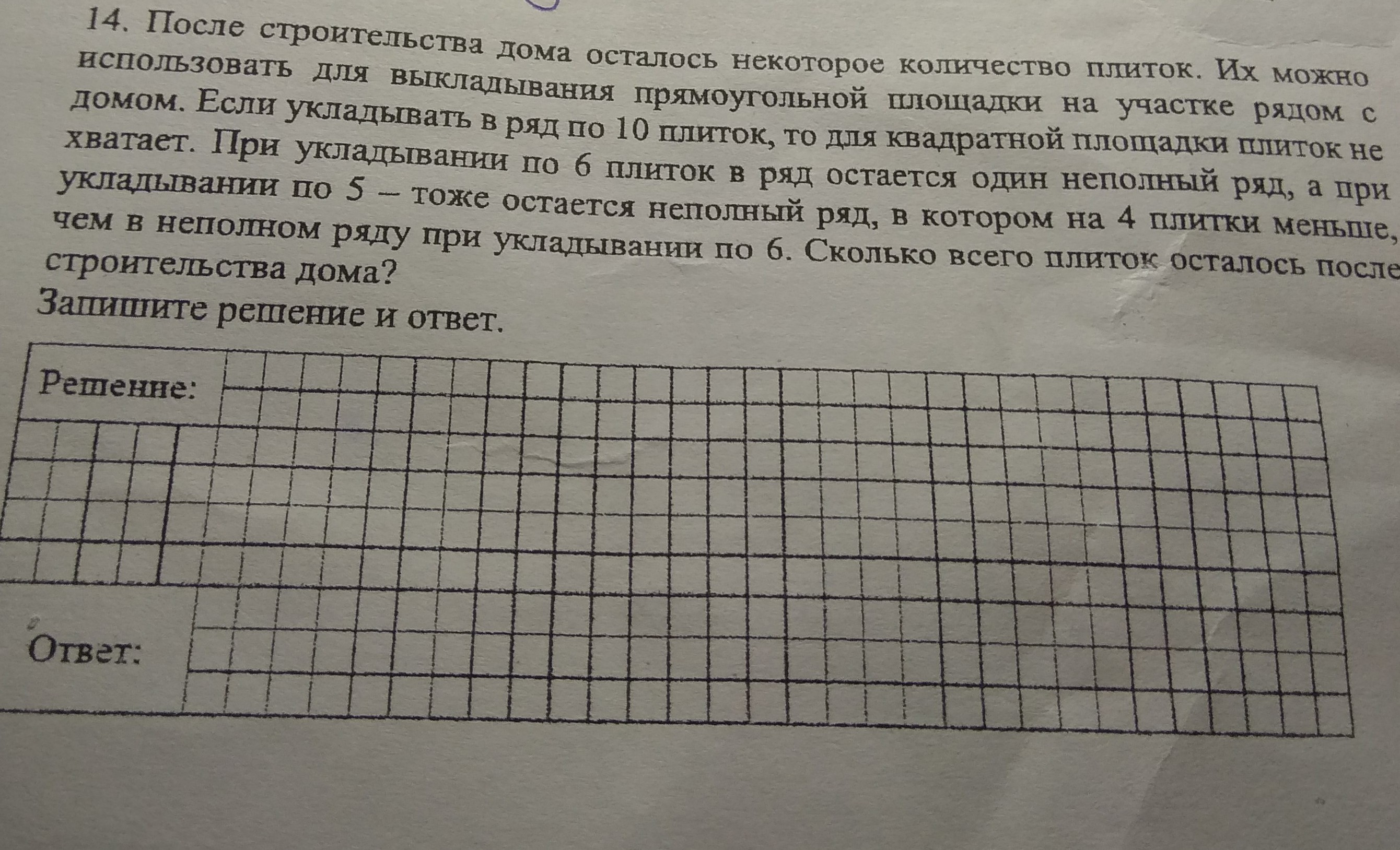 4) При перекладывании плитки по 5 каждый ряд по 6 дает 1 лишнюю плитку, а остаток 5 дал бы полный ряд при делении на 5.