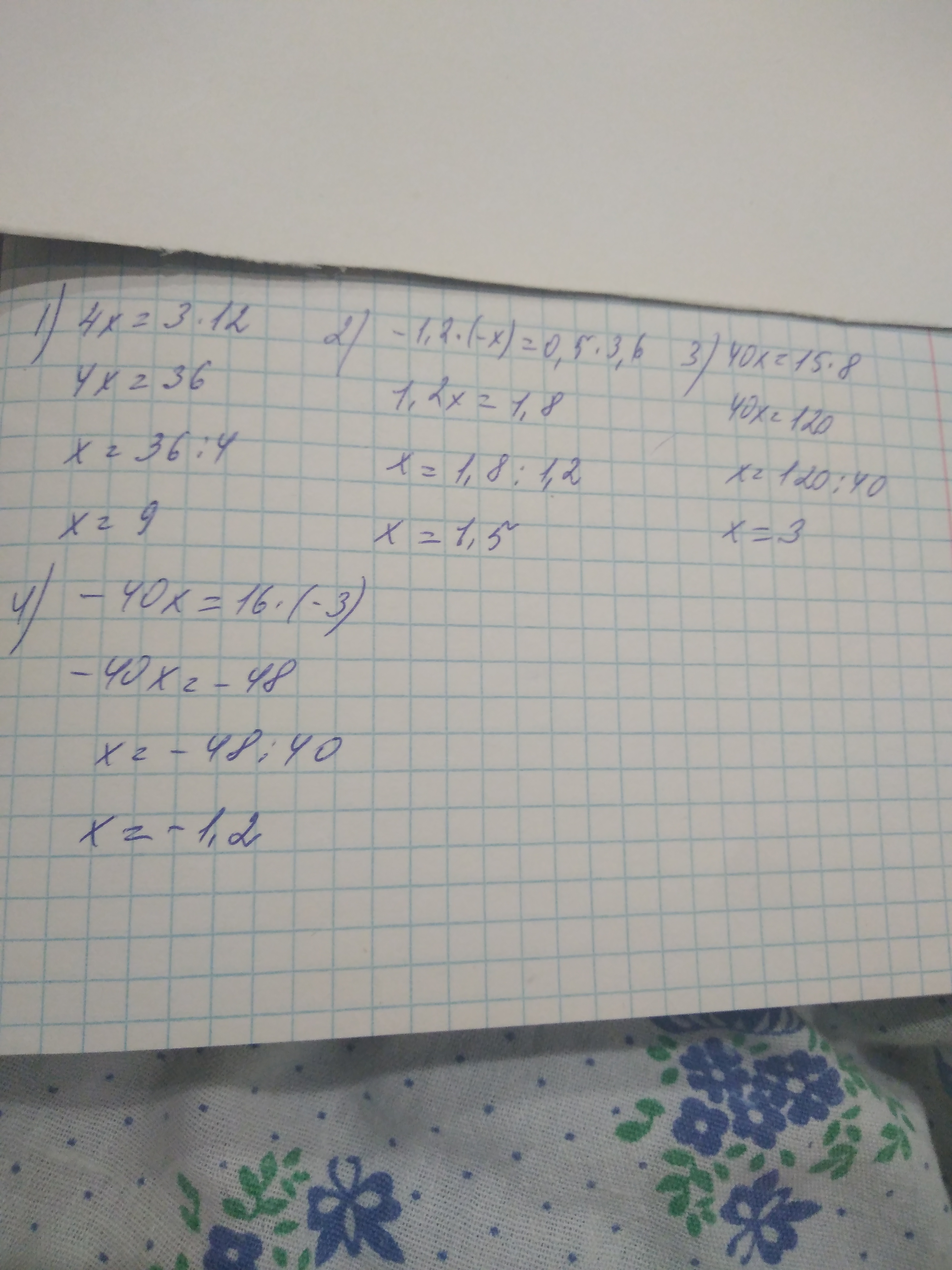 Помогите пожалуйста.найдите чему равно х в пропорции:х:3=12:4; 3,6:(-1,2)=-х:0,5; 15/х=40/8; 40/-3=16/-х