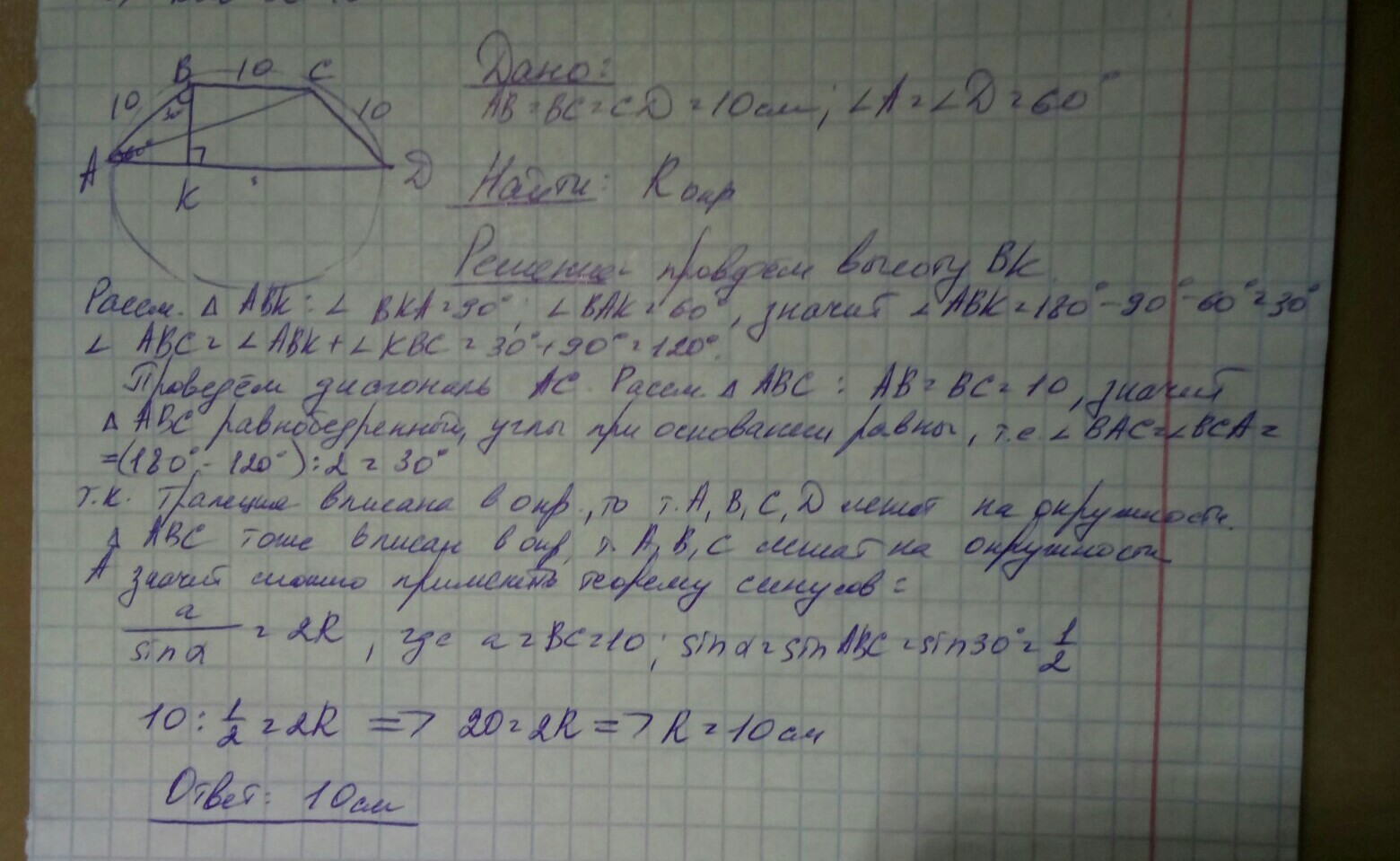 Боковые стороны и меньшее основание трапеции равны 10 см,а один из ее углов равен 60°. Найдите радиус окружности, описанной около этой трапеции.