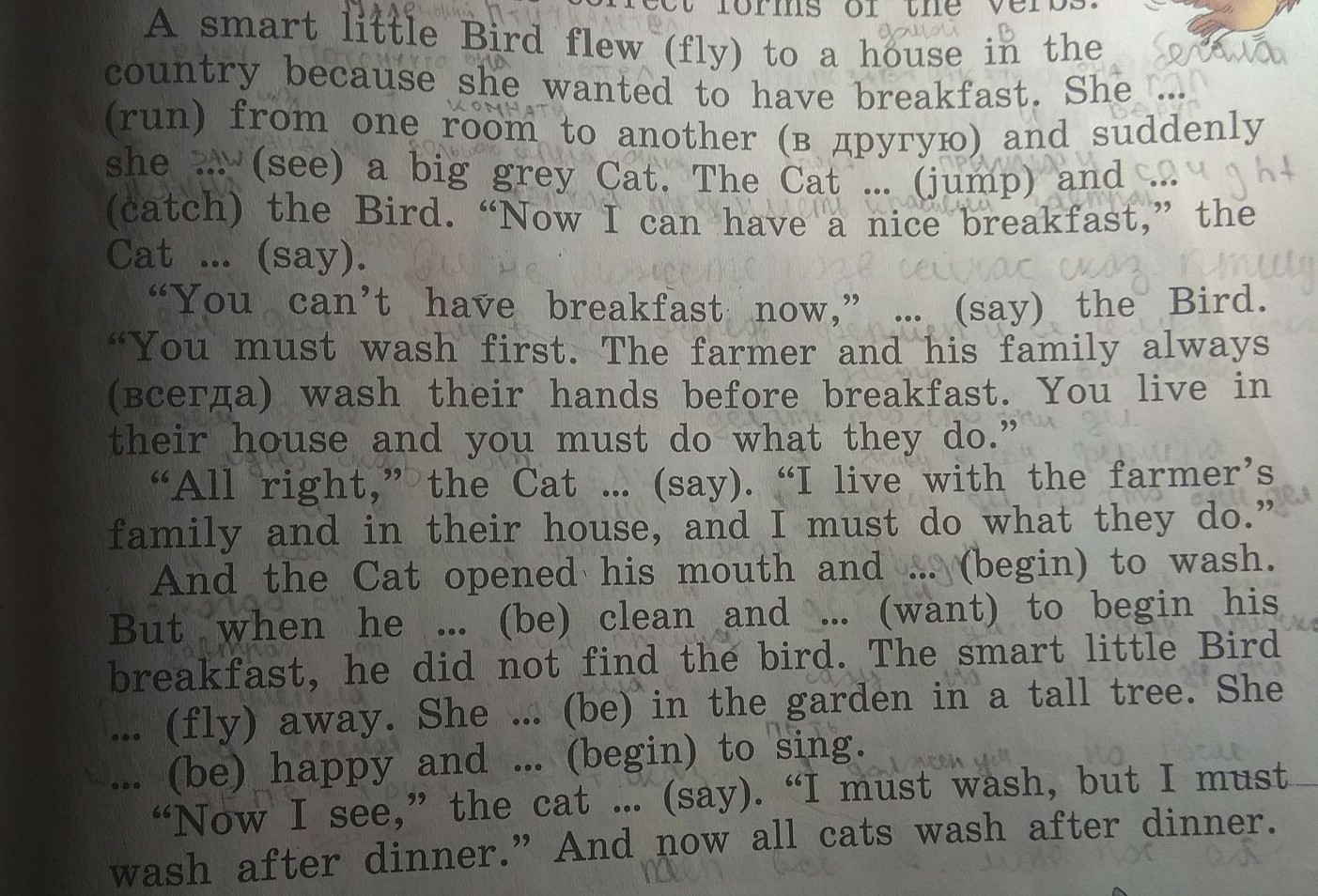 Современная маленькая птица летела в дом в стране потому что она хотела позавтракать. Она бежала с одной комнаты в другую как вдруг, увидела большого серого кота. Кот прыгнул и поймал птицу. "Сейчас я хорошо позавтракаю" сказал кот.