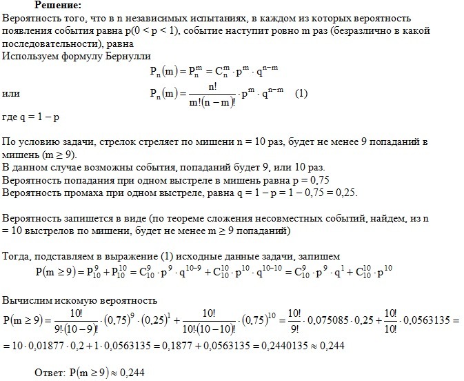 Вероятность того, что в серии из 10 выстрелов будет 9 попаданий, равна:P=P10(9)=C910⋅0.759⋅0.251=0.188.Здесь число сочетанийC910=10!/9!⋅(10−9)!=10!/9!⋅1!=10/1=10,Ответ: 0.188.