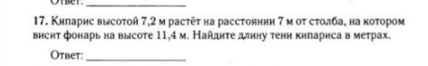 x/(7+x)=7,2/11,4 11,4*x=7.2*(7+x) 11,4x=50,4+7,2x 11,4x-7,2x=50,4 4,2x=50,4 x=50,4:4,2 x=12м тень