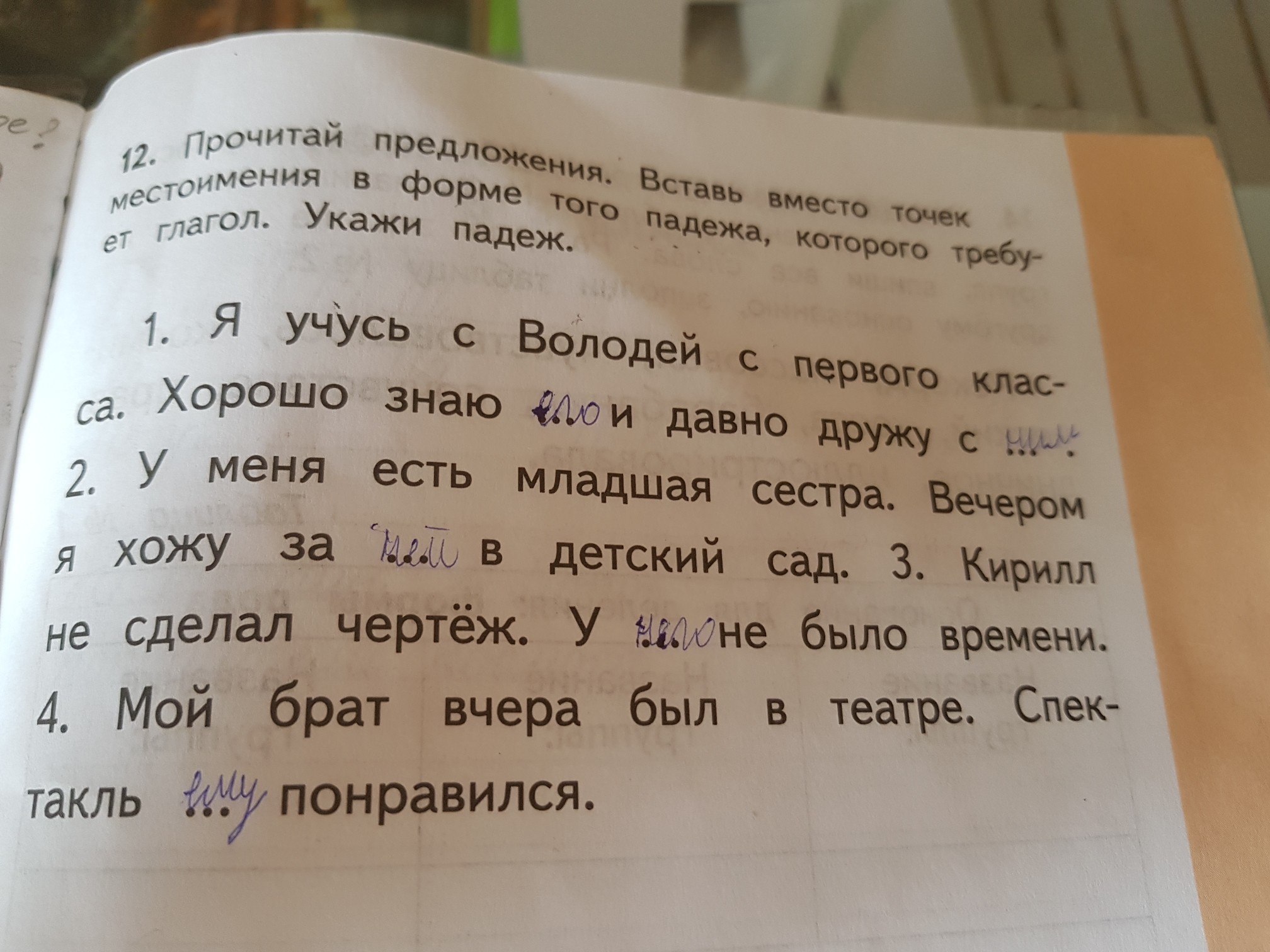 прочитай предложения. вставь место точек местоимения в форме того падежа, которого требует глагол. укажи падеж.