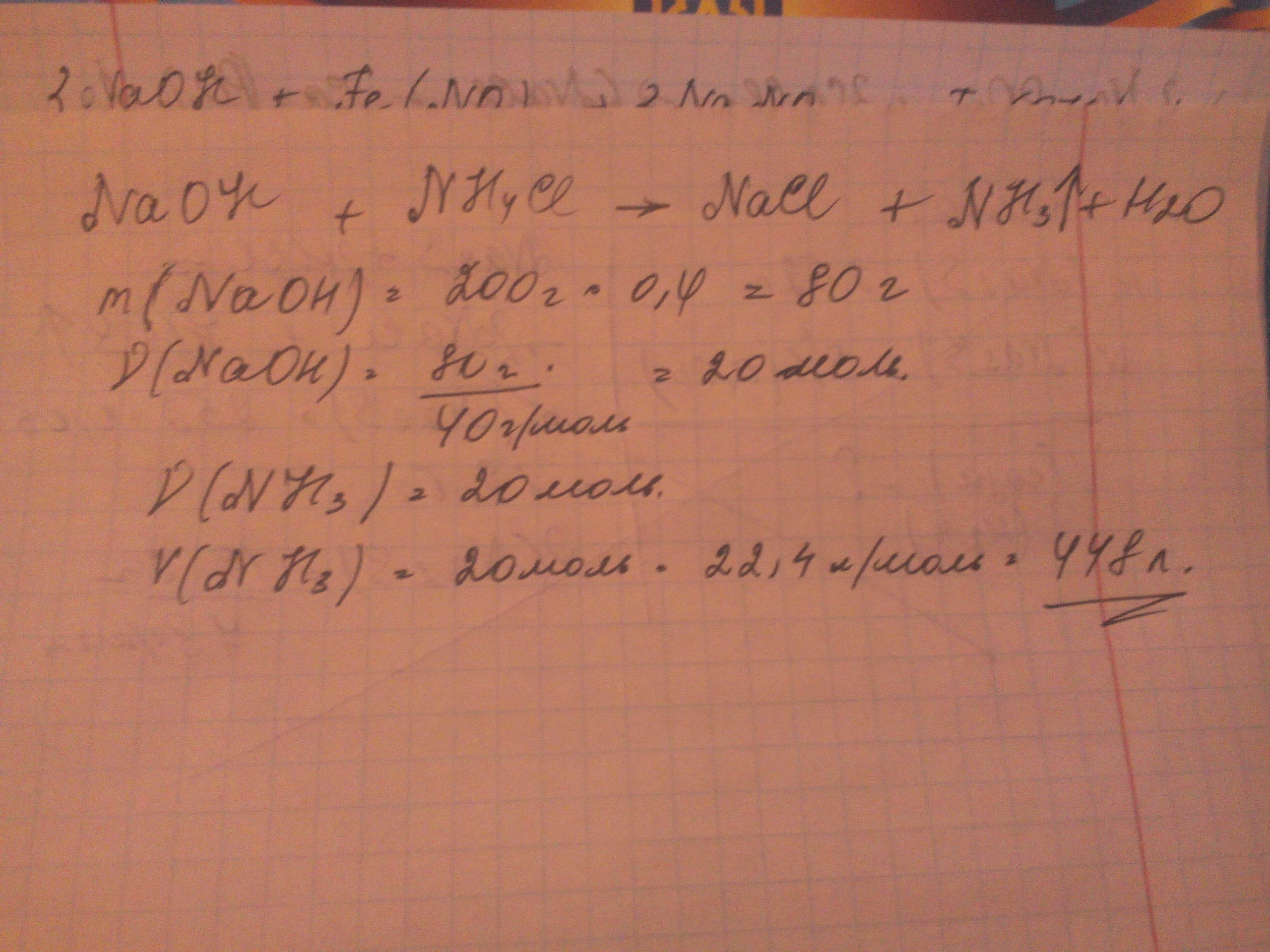 рассчитайте объем газа, выделенного в результате взаимодействия раствора гидроксида натрия массой 200 г с массовой долей NaOH 40% c хлоридом аммония