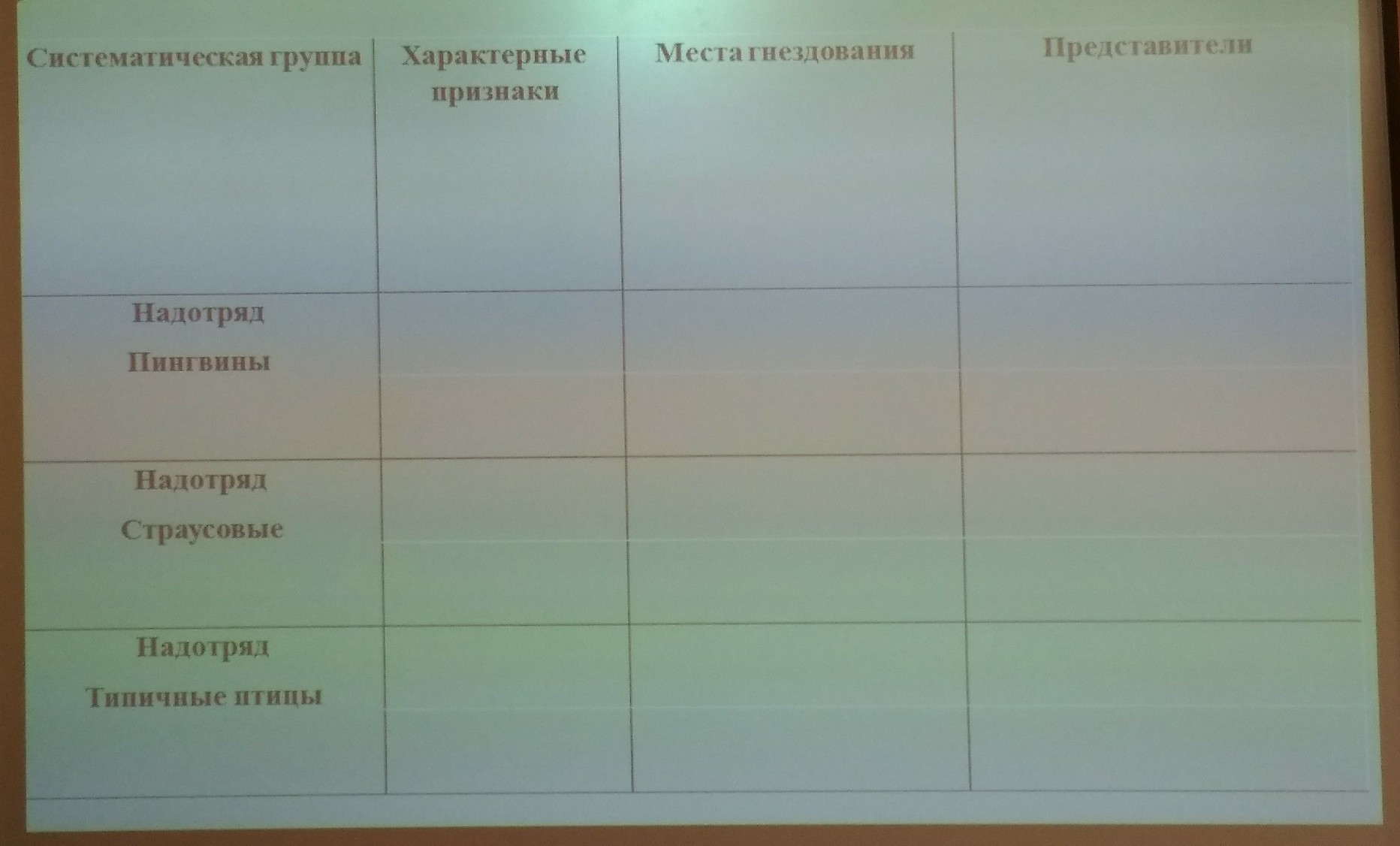 Характерные признаки:теплокровные животные; приспособлены к полету; передние конечности превратились в крылья; тело покрыто перьями, видоизменились задние конечности; облегченный скелет; хорошее развитие мышц, обеспечивающих полет; отсутствуют зубы, мочевой пузырь; один яичник у самок; есть воздушные мешки, которые обеспечивают двойное дыхание; сердце четырехкамерное, интенсивный обмен веществ; размножаются откладыванием яиц, проявляют заботу о потомстве; много птиц является перелетными, и совершают длительные миграции. Место гнездования: деревья.