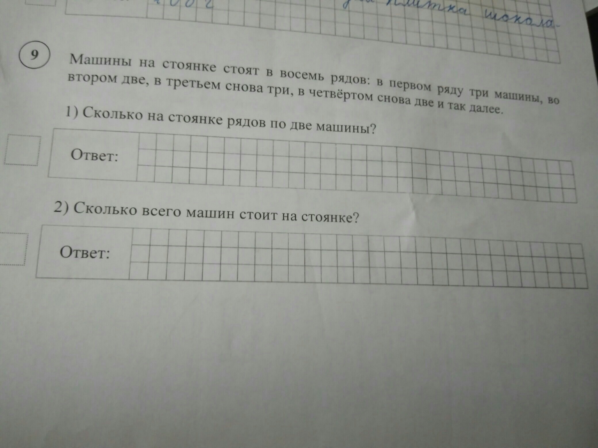 машины на стоянке стоят в восемь рядов в первом ряду 3 машины во втором 2 в третьем снова 3 А в четвёртом снова 4 и так далее первый вопрос Сколько на стоянке рядом по 2 машинах второй вопрос Сколько всего машин стоит на стоянке помоги пожалуйста