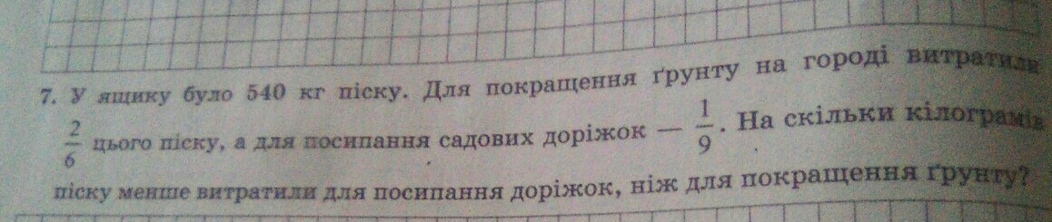 у ящику було 540 кг піску для покращення грунту на городі витратили 2/ 6 цього піску а для посипання садових доріжок 1/9 На скільки кілограмів піску менше витратили для посипання доріжок ніж для покращення грунту