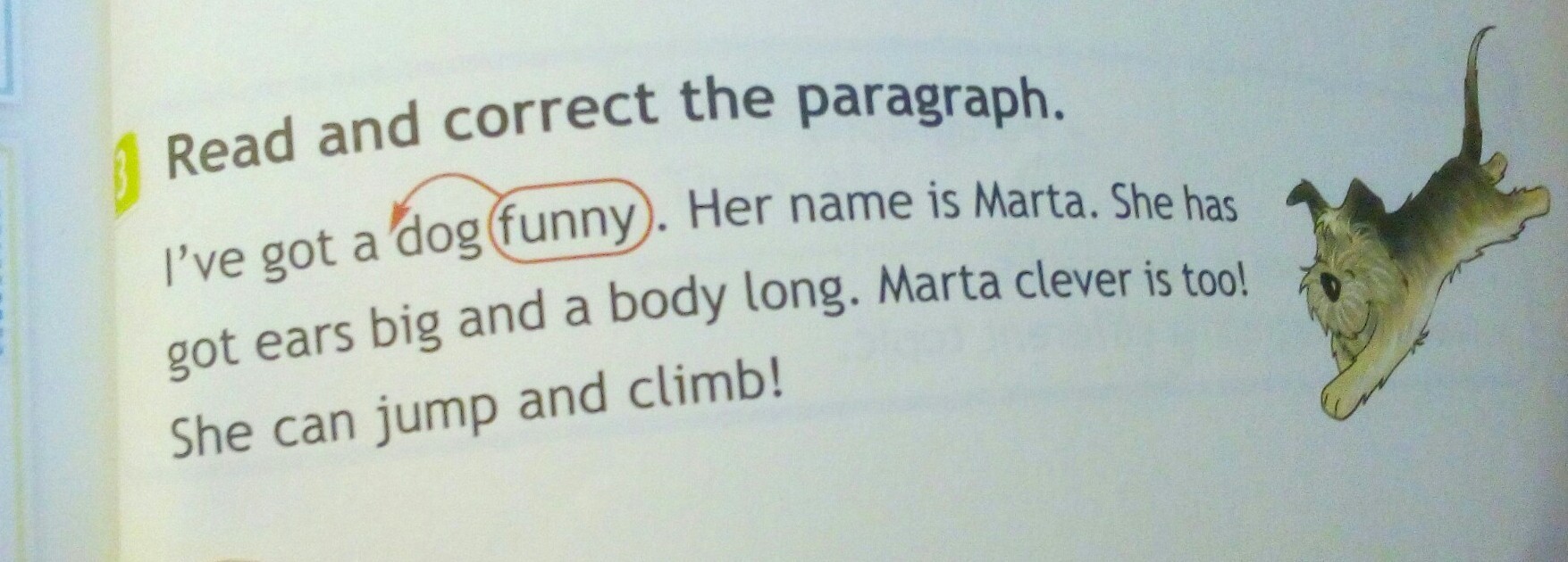 I've got a funny dog. Her name is Marta. She has got big ears and long body. Marta is too clever! She can jump and climb!