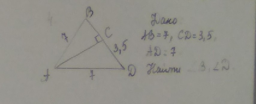 Рассмотрим ∆AСD. Он прямоугольный, СD=3,5 и это катет, АD=7 и это гипотенуза. Катет в два раза меньше гипотенузы, следовательно, уголСАD=30°