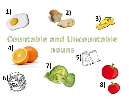Look at the picture and name the food. Next to your words write “C” (if the noun is countable) and “U” (if the noun is uncountable).