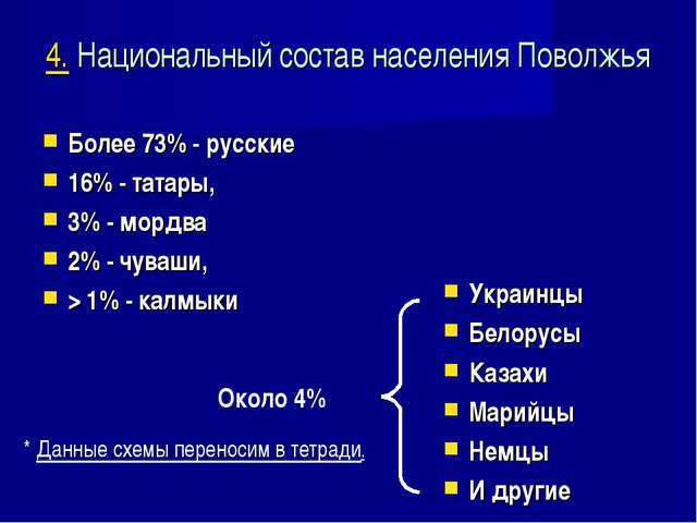 Среди всех народов, обитавших на территории Поволжья, наибольшая доля приходится на русских. Русские женщины носили наряд, который состоял из холстовой рубашки, именуемой «рукавами», и сарафаном. Для бедных семей привычным костюмом служили сарафаны, для изготовления которых применяли крашеный холст. На торжества надевали сарафаны, сшитые на основе китайки. Возможности богатых семей позволяли им носить сарафаны, для создания которых использовали шелк, плис и бархат.