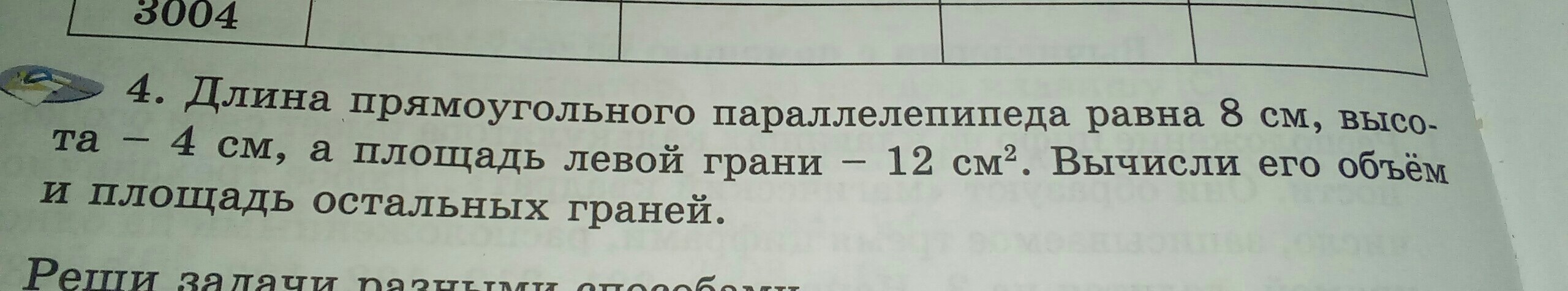 Длина прямоугольника параллелепипеда равна 8 см высота 4 см а площадь его грани 12 квадратных сантиметров вычисли его объем и площадь остальных граней решить задачу пожалуйста! !!!