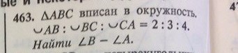 окружность разбита на равные части, обозначим градусную величину части за х, тогда ∪АВ содержит две таких части ∪АВ=2х, ∪ВС содержит 3 таких части ∪ВС=3х, ∪СА содержит 4 таких части ∪СА=4х