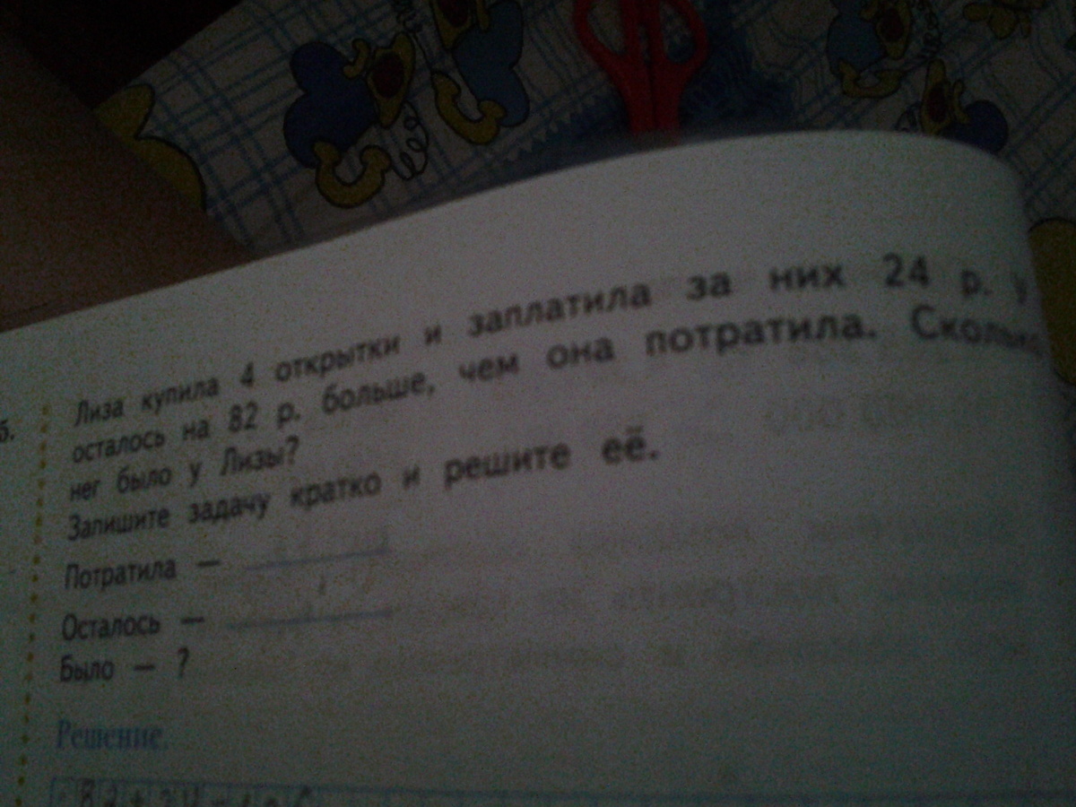 Ответ: 106 руб было у Лизы. В этой задаче лишнии данные о количестве открыток (4 открытки)