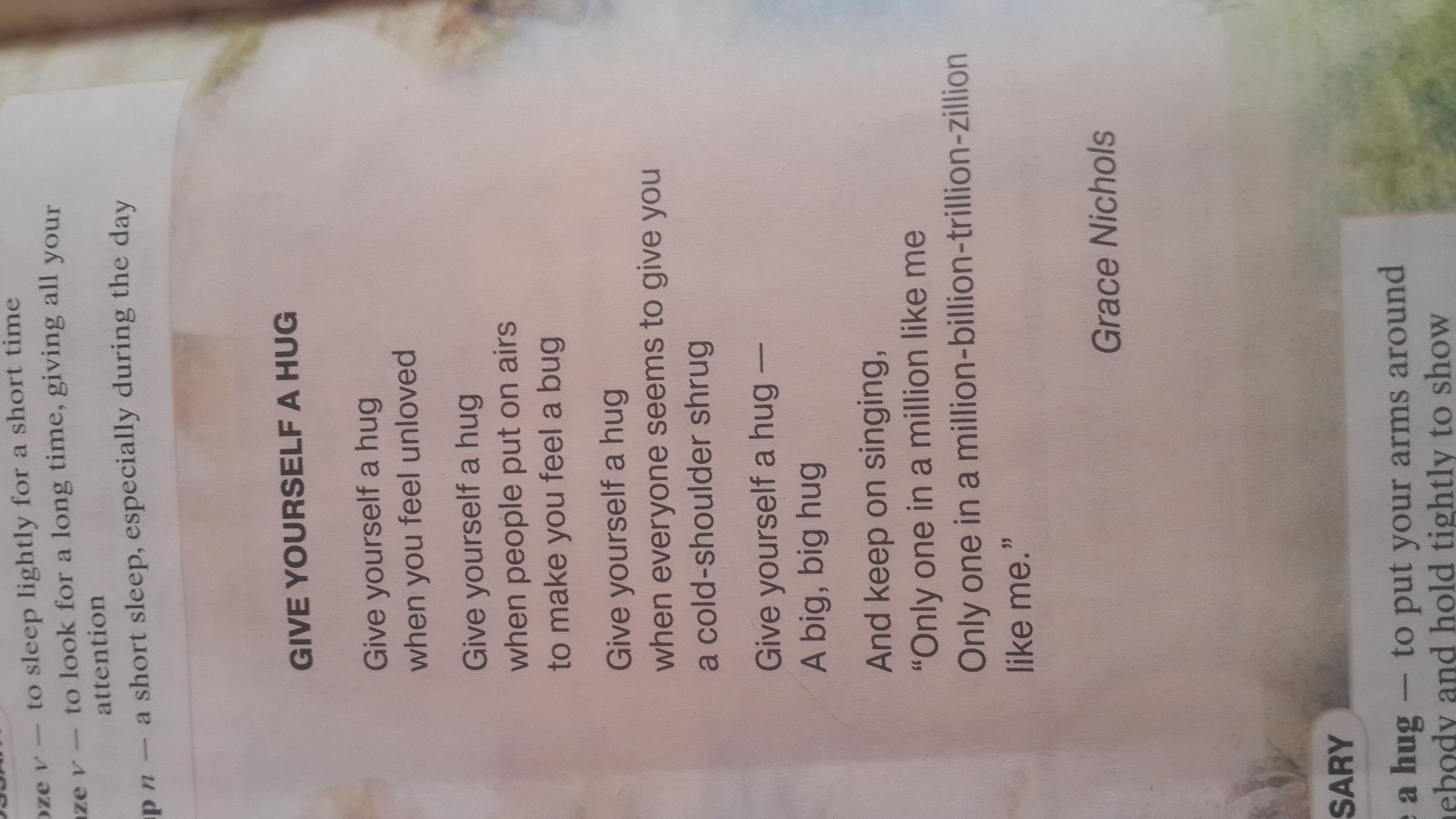 Дайте себе обнять, когда вы почувствуете себя нелюбимыми. Дайте себе обнять, когда люди уходят , чтобы они почувствовали ошибку. Обнимите себя, когда все, кажется, что вам не дают поцеловаться . Обнимите себя. Большое, большое объятие. И продолжайте петь: «Только один миллион, как я, только один из миллионов в миллион триллионов, как я». Грейс Николс