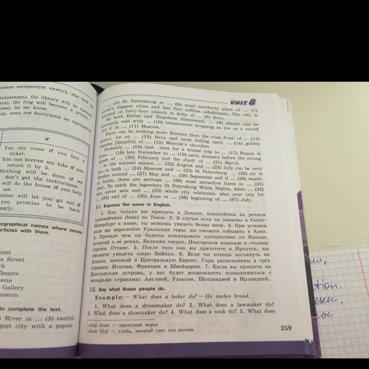 1.Once you arrive in London, take a boat ride on the Thames. 2.If you go to St. Petersburg in June you can see the white nights. 3.If you cross the Ural Mountains, you will be able to visit Asia. 4. Before you plan a trip to Canada, read about its rivers, Great Lakes, Niagara Falls and the capital of the country Ottawa. 5. After you arrive in Irkutsk, you can see lake Baikal. 6. If you want to look at the Alps, go to Central Europe. The mountains are located in three countries: Italy, France and Switzerland. 7. When you arrive on the British Isles, you will have the opportunity to get acquainted with four countries: England, Wales, Scotland and Ireland.