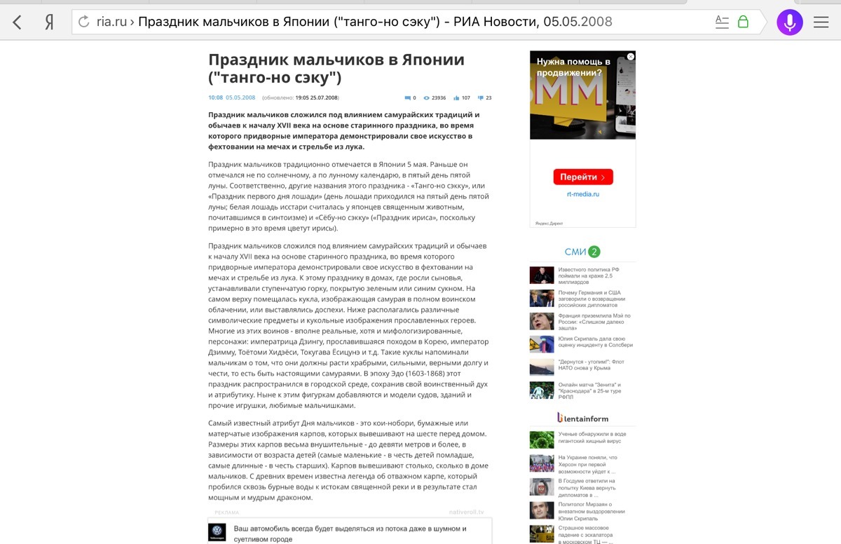 Праздник мальчиков традиционно отмечается в Китае 5 мая. Раньше он отмечался не по солнечному, а по лунному календарю, в пятый день пятой луны. Соответственно, другие названия этого праздника ‑ «Танго‑но сэкку».Праздник мальчиков сложился под влиянием самурайских традиций и обычаев к началу XVII века на основе старинного праздника, во время которого придворные императора демонстрировали свое искусство в фехтовании на мечах и стрельбе из лука. К этому празднику в домах, где росли сыновья, устанавливали ступенчатую горку, покрытую зеленым или синим сукном. На самом верху помещалась кукла, изображающая самурая в полном воинском облачении, или выставлялись доспехи. Ниже располагались различные символические предметы и кукольные изображения прославленных героев. . В эпоху Эдо (1603‑1868) этот праздник распространился в городской среде, сохранив свой воинственный дух и атрибутику. Ныне к этим фигуркам добавляются и модели судов, зданий и прочие игрушки, любимые мальчишками.Самый известный атрибут Дня мальчиков ‑ это кои‑нобори, бумажные или матерчатые изображения карпов, которых вывешивают на шесте перед домом. Размеры этих карпов весьма внушительные ‑ до девяти метров и более, в зависимости от возраста детей (самые маленькие ‑ в честь детей помладше, самые длинные ‑ в честь старших). Карпов вывешивают столько, сколько в доме мальчиков. С древних времен известна легенда об отважном карпе, который пробился сквозь бурные воды к истокам священной реки и в результате стал мощным и мудрым драконом. С тех пор карпа почитают как божество.