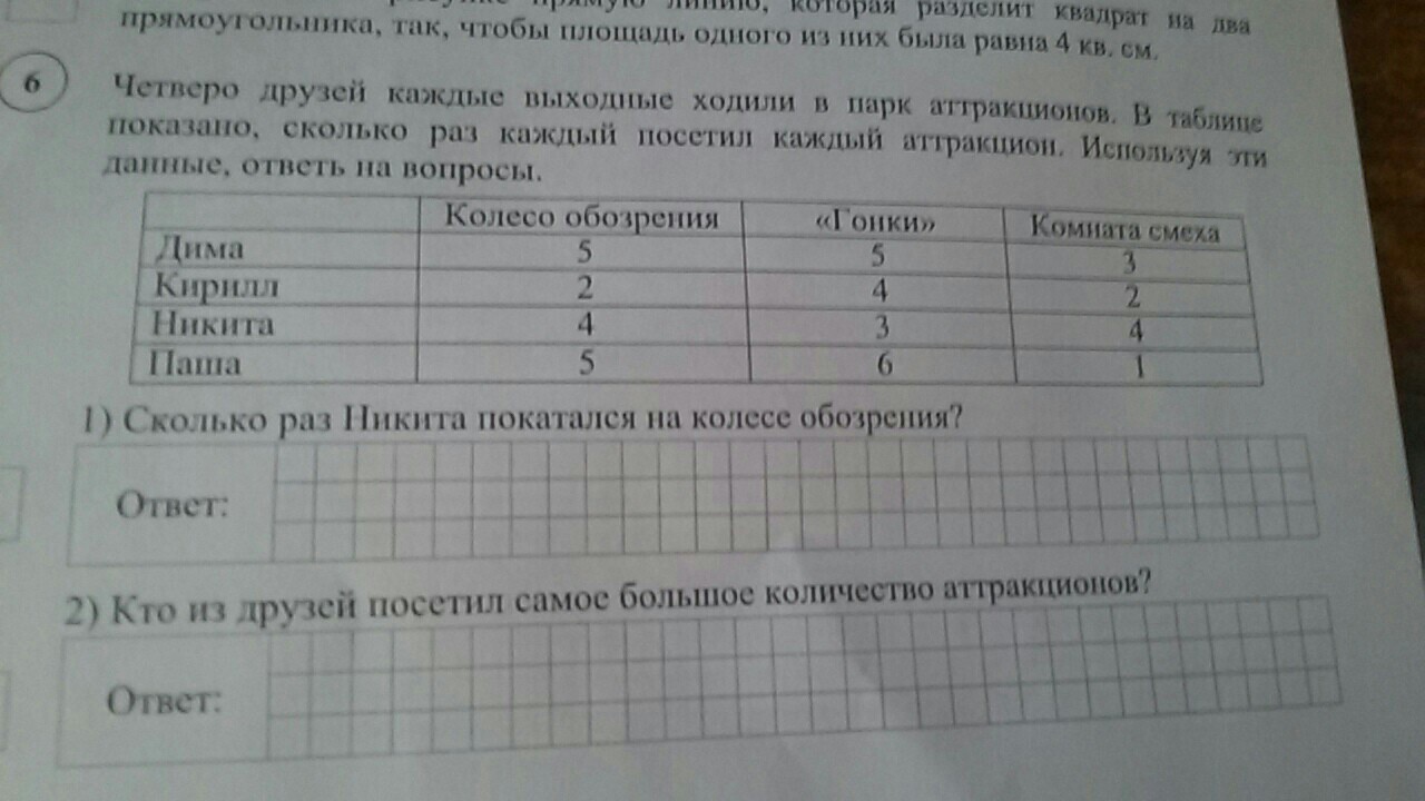 четверо друзей каждые выходные ходили в парк аттрак ционов В таблице показано сколько раз каждый посетил каждый аттракцыон Используя эти данные ответить на вопросы 1. Сколько раз Никита покатался на колесе обозрения ? 2.Кто из друзей посетил самое большое количиство аттракцыонов