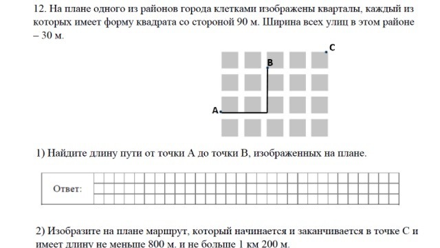 от точки С проходим влево три квартала и 2 улицы, спускаемся вниз проходим 2 квартала и 1 улицу, сворачиваем направо, проходим 3 квартала и 2 улицы, поднимаемся вверх по изображению, проходим 2 квартала и 1 улицу (итого выходит 990 м)