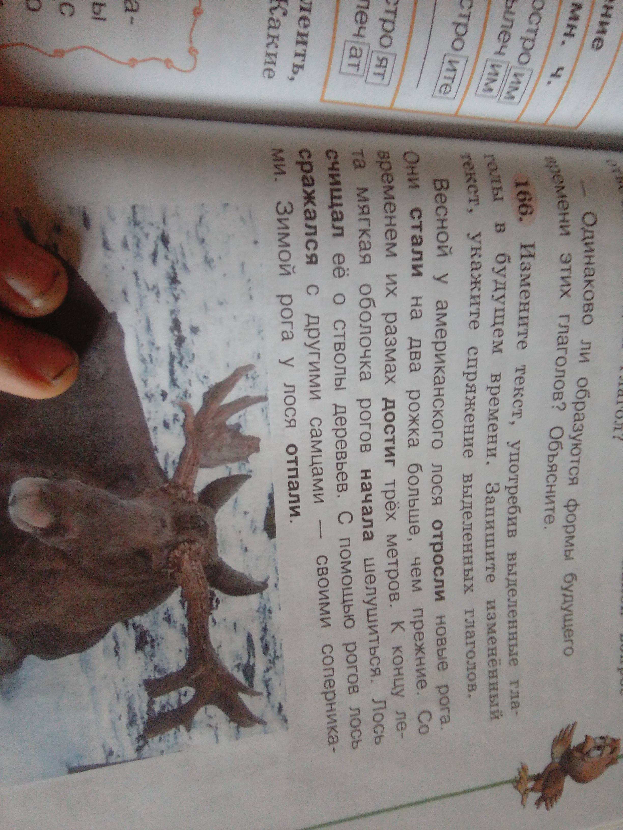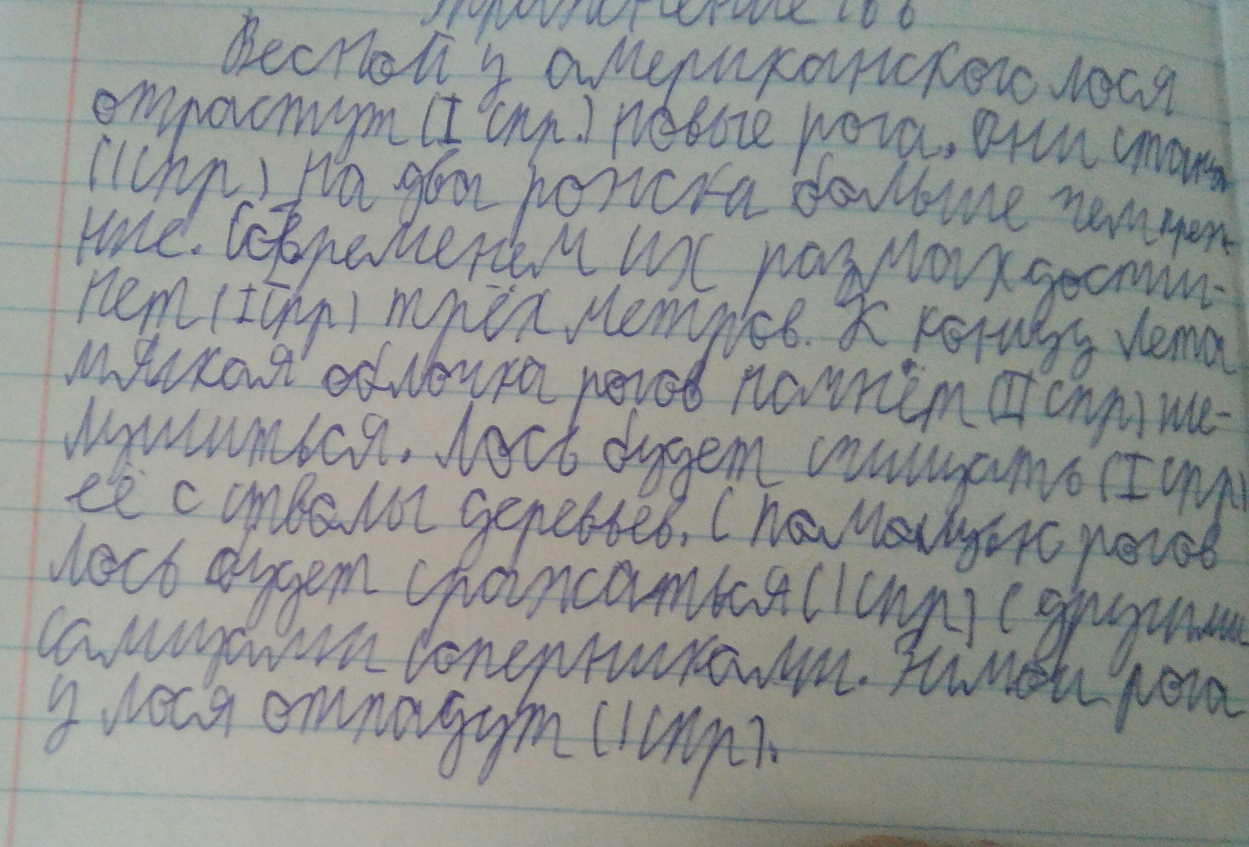 Весной у американского лося отрастут (1 спряжение) новые рога. Они станут (1 спряжение) на два рожка больше, чем прежние. Со временем их размах достигнет (1 спряжение) трех метров. К концу лета мягкая оболочка рогов начнет (1 спряжение) шелушиться. Лось будет счищать (1 спряжение) ее о стволы деревьев. С помощью рогов лось будет сражаться (1 спряжение) с другими самцами - своими соперниками. Зимой рога у лося отпадут (1 спряжение).