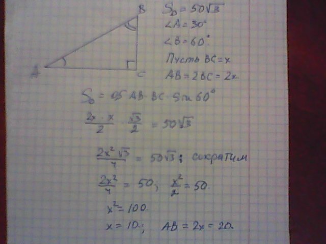 Помогите пожалуйста очень срочно площадь прямоугольного треугольника равна 50 корень из 3 один из острых углов равен 30 градусов Найдите длину гипотенузы