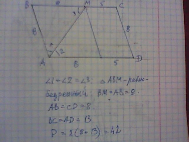 Биссектриса угла A параллелограмма ABCD пересекает прямую BC в точке M, причём BM=8, MC=5.