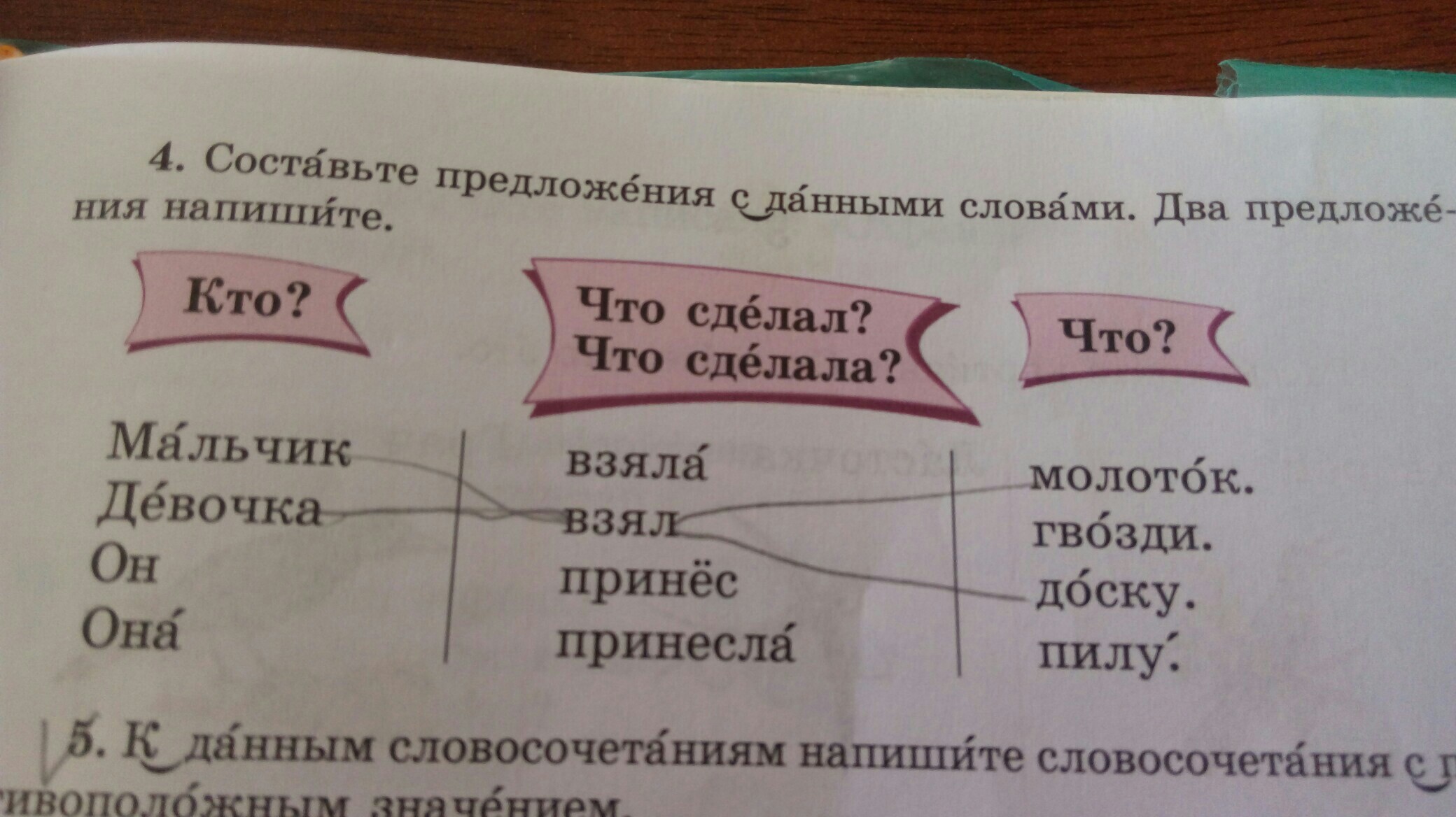 Мальчик взял молоток. Он принёс доску. Девочка взяла гвозди. Она принесла пилу.