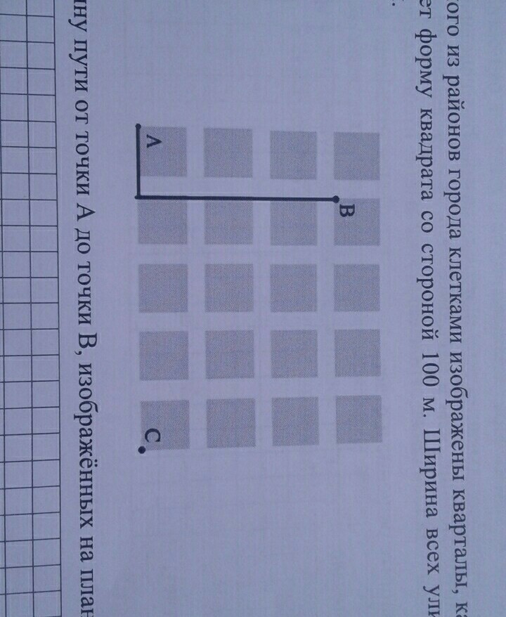 На плане одного из районов города клетками изображены кварталы, каждый из которых имеет форму квадрата со стороной 100м. Ширина всех улиц в этом районе - 30м