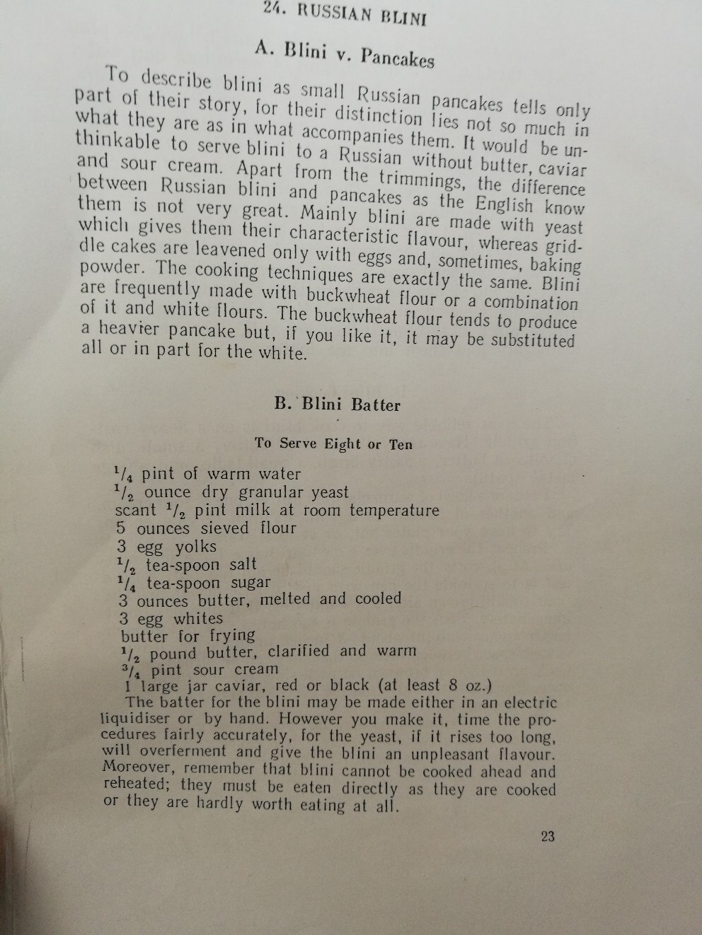24. РУССКИЙ БЛИНЫ А. Блины против блинов. Описывать блины, так как маленькие русские блины говорят только о части своей истории, ибо их ложь не столько в том, что они есть, сколько в том, что их сопровождает. Это быть un-blini и подавать без сливочного масла, икру сметаны. Помимо различия между Русские блины и блины, как знают их англичане, не очень велики. В основном блины сделаны с которые придают им свой характерный вкус, тогда как цельные торты заквашивают только яйцами и, иногда, порошок для выпечки. Техника приготовления одинакова. часто делаются кукурузную пшеничную муку или ее комбинацию и белую муку. Мука гречневая имеет тенденцию к более тяжелой блин, но, если вам это нравится, он может быть заменен полностью или частично белым. Б. Блини Бэттер Подавать Восемь или десять ila пинту теплой воды ila унция сухого сыпучего дрожжевого белка 1/2 пинтового молока в комнате температура 5 унций просеянная мука 3 чайная ложка соль чайная ложка сахара 3 унции масло, растаяло и охлажденные яичные белки 3 сливочное масло для обжаривания фунтового масла, осветленный и теплый саркоид 1 желтая икра, красная или черная (не менее 8 унций). Битва для блинов может быть выполнена либо в электрическим жидкокристаллическим устройством или вручную. Однако вы делаете это, время процедуры достаточно точно, для дрожжи, если они слишком долгое возрастают, будут чрезмерными и дают блины неприятный авер. Более того, помните, что блины не могут быть приготовлены впереди и разогреты; их нужно есть прямо, так как они приготовленные или их вряд ли стоит есть их всегда.