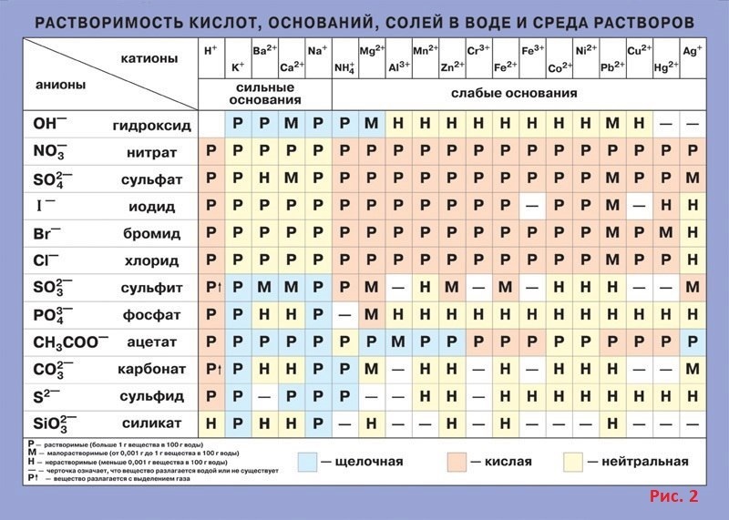 Чтобы узнать в какой степени окисление стоит тот или иной элемент, нужно посмотреть в таблицу растворимости (рис.2).